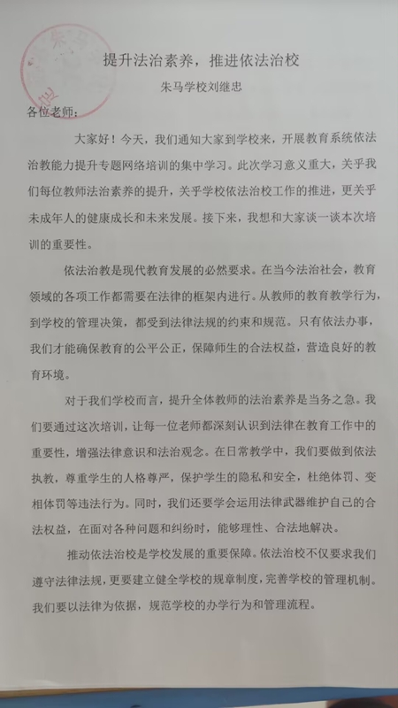 ~ 为进一步强化师德师风建设,推动学校依法治教和管理水平整体提升,2025年7月7日上午,定远县朱马学校组织教育系统依法治教能力提升专题网络培训集中学习,学校全体教师参训。