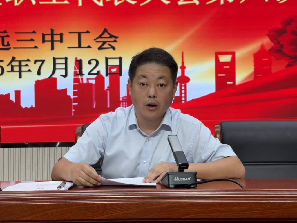 ~ 余忠亮代表校长室作工作报告,报告分为“学校2024-2025学年工作概述”和“学校2025-2026学年工作展望”两部分,“概述“部分分别从党建工作、德育工作、师资队伍、学校治理等六个方面回顾总结了我校一年来的工作,“展望”部分则是从加强思想教育、增强忧患意识等六个方面对新学年重点工作作出了部署与要求。