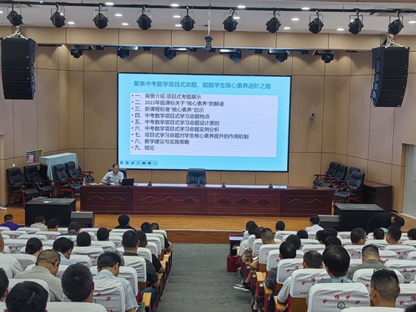 ~ 在专题讲座环节,主办方邀请了该县第三初级中学副校长、市中青年骨干教师刘成功老师授课。刘老师围绕“聚焦中考数学项目式命题,赋能学生核心素养进阶之路”这一主题,从政策背景、理论内涵到教学实践进行了系统讲解。解读了《义务教育数学课程标准(2022年版)》中关于核心素养的最新要求,分析了近年来中考数学命题的变化趋势和考查重点;分享了自己在课堂教学中落实核心素养的经验和案例。刘老师强调,“数学着重夯实基础,回归数学本质。”中考通过强化基本概念和原理考查,引导教学回归课标,同时关注知识系统性与思维过程,检验学生对数学思想方法的掌握程度。数学核心素养的培养过程侧重学生的自主探究和自我体验,更多地依靠学生自身在实践中的摸索、积累和体悟。教师在课堂上经常设计、引导学生参与动手操作,能大大地提高学生的探究能力。数学核心素养的培养与数学的课堂教学相辅相成,指引、辐射数学课程教学,彰显数学教学的育人价值,使之为人的终身发展服务,从而使“教学”升华为“教育”。