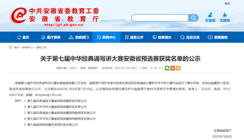 第七届经典诵写讲大赛安徽省预选赛获奖名单