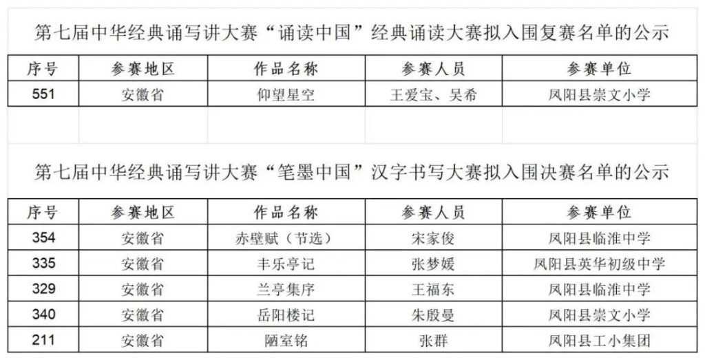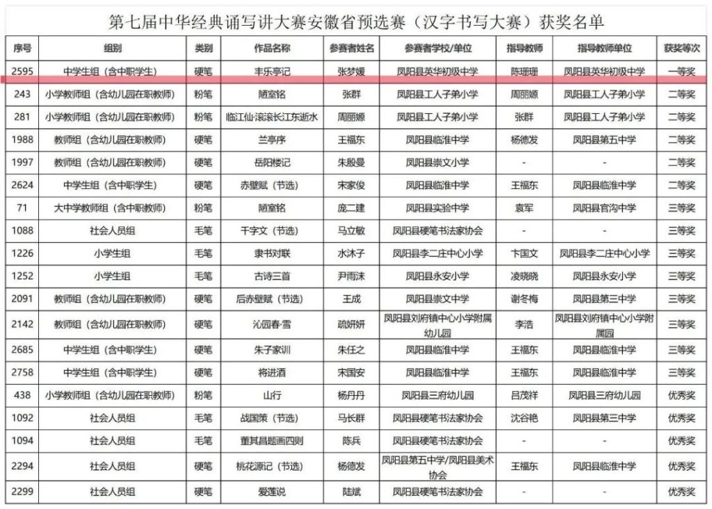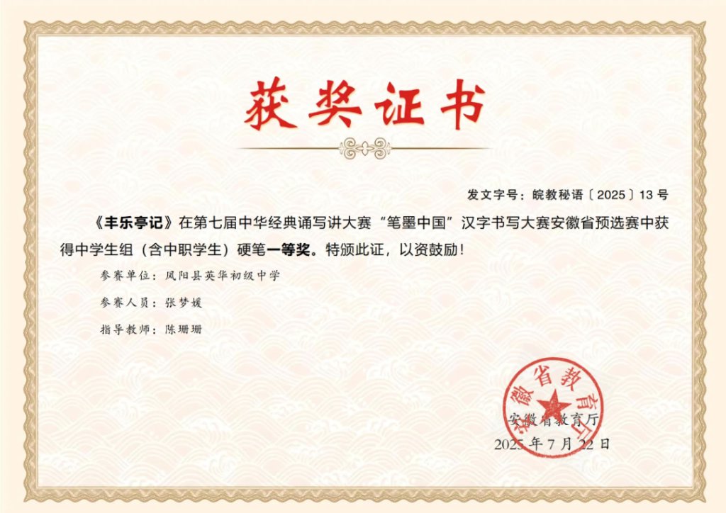 ~ 根据《安徽省教育厅关于组织参加第七届中华经典诵写讲大赛的通知》( 皖教秘语〔2025〕4号)精神,省教育厅组织了第七届中华经典诵写讲大赛“诵读中国”经典诵读大赛和“笔墨中国汉字书写大赛的省级预选赛。滁州市凤阳英华中学张梦媛同学作品《丰乐亭记》荣获汉字书写中学生组硬笔类一等奖,并拟被推送参加全国大赛!