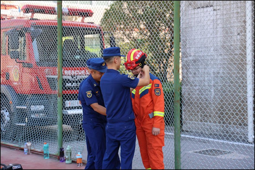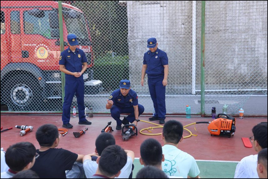 ~ 在器材展示环节,消防员李圣碧向同学们详细介绍了各类专业消防装备。从无齿锯到液压破拆工具组,从风力灭火机到消防灭火防护服,每一件装备都引起了同学们的浓厚兴趣。“这套防护服可以承受800度高温,但穿脱需要严格训练,感兴趣的同学可以上来体验。”李圣碧一边讲解队员们一边示范,让同学们直观了解了消防员的工作装备。