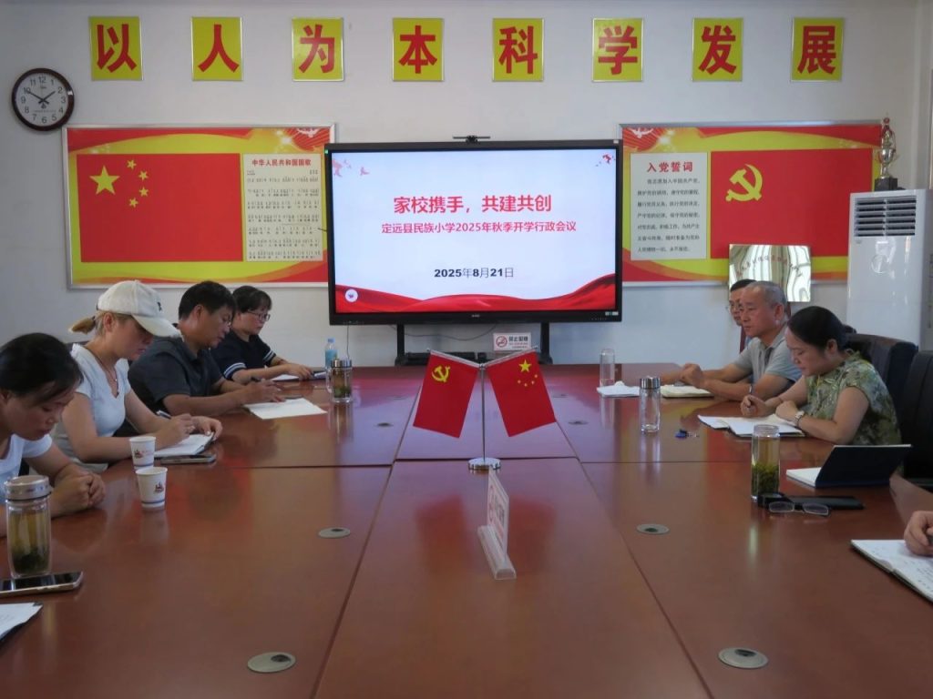 ~ 8月21日,定远县民族小学召开了2025年秋季开学行政会议,学校全体行政人员、各年级主任和家长委员会代表共同参会,围绕”高质量发展”核心目标,共商学校发展大计,推动家校协同育人走向深入。