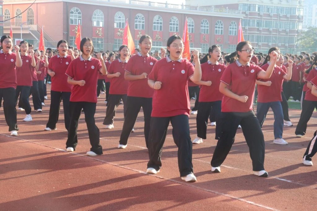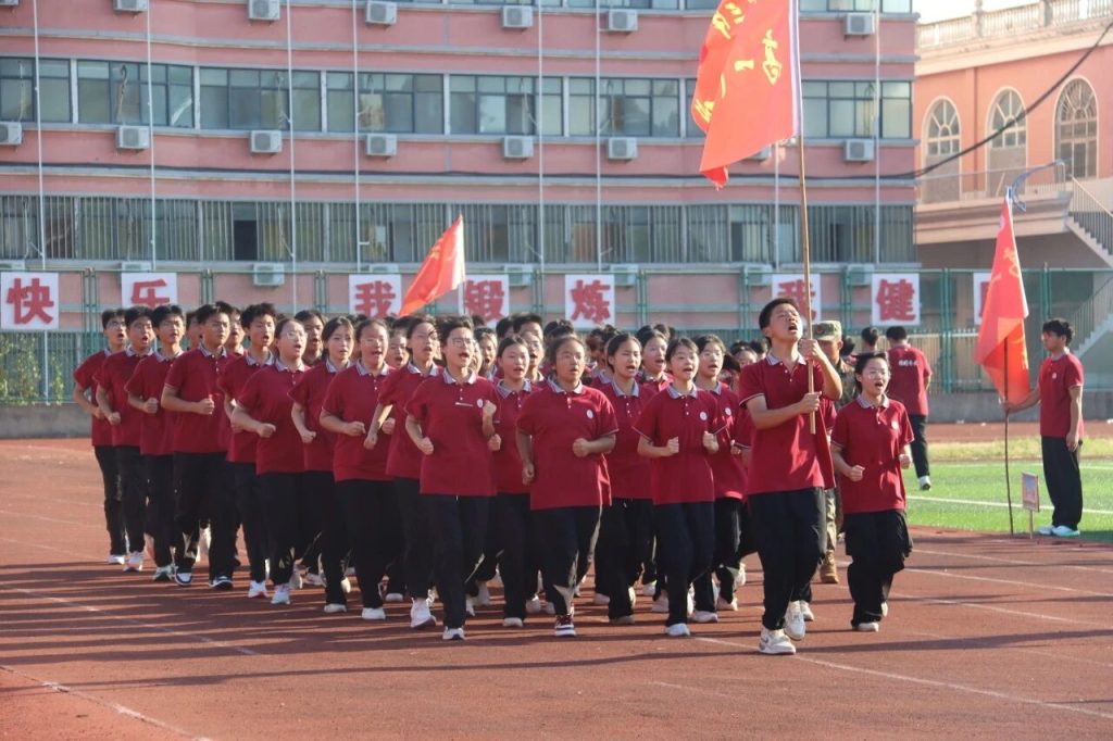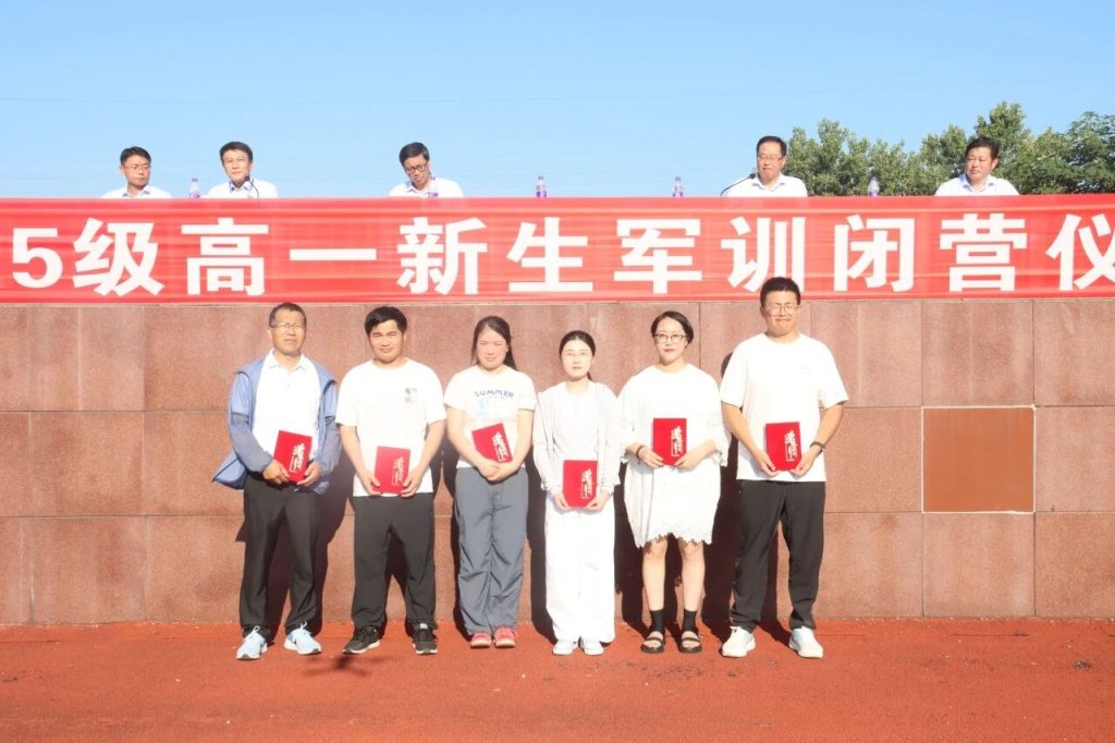 ~ 在雄壮的国歌声中,全体师生肃立行礼,闭营式正式拉开帷幕。紧随其后的是精彩纷呈的军训成果汇演:同学们合唱《强军战歌》,声音铿锵,气势如虹;高一(1)班进行队列展示,步伐整齐,动作划一;女生军体拳刚柔并济,男生擒敌拳虎虎生风;跑操展示更是节奏鲜明、朝气蓬勃,充分展现出2025级新生经过军训洗礼后的昂扬姿态和集体凝聚力。
