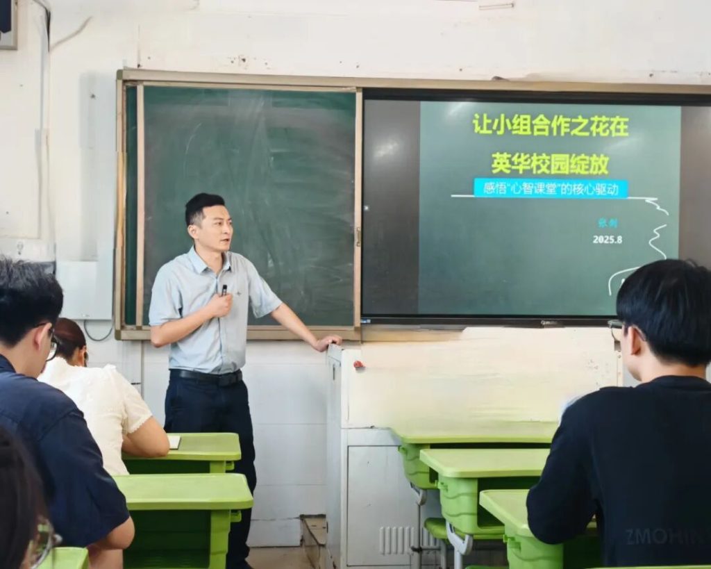 ~ 感受心智课堂的真实,方能抓住学习的关键。8月21日上午,初中部教学副校长张剑为七年级全体教师及八年级部分新教师业务培训——小组合作学习策略。“让小组合作之花在英华校园绽放”,他从小组建设的作用,实施依据,组织有效合作的策略,如何规范开展,实施过程中的问题及对策等进行了全方面阐述。