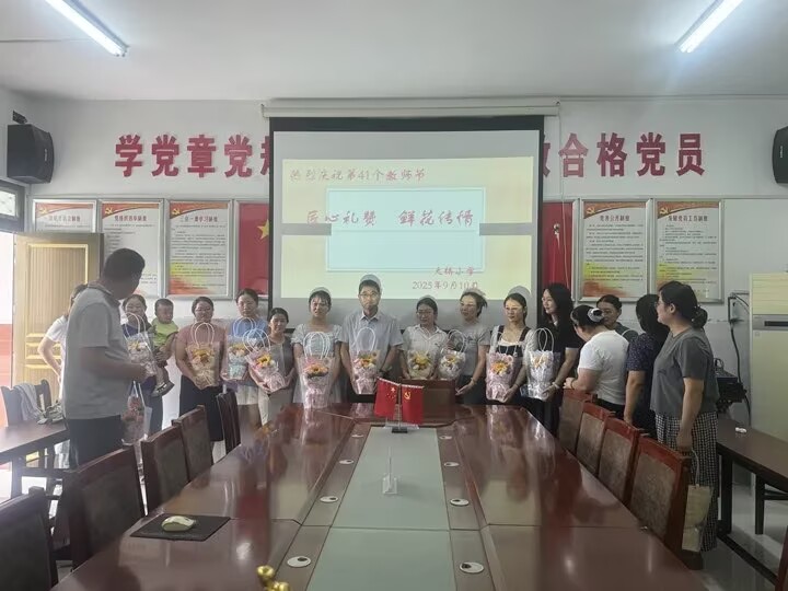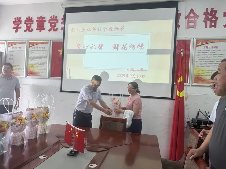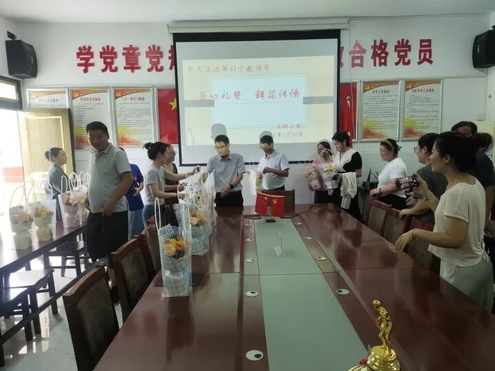 ~ 9月10日上午,大桥小学党支部书记、校长罗培齐为老师们送上美丽的鲜花和节日的祝福。对他们长期以来为学校教育事业的发展付出的辛勤努力和做出的卓越贡献表示衷心的感谢。
