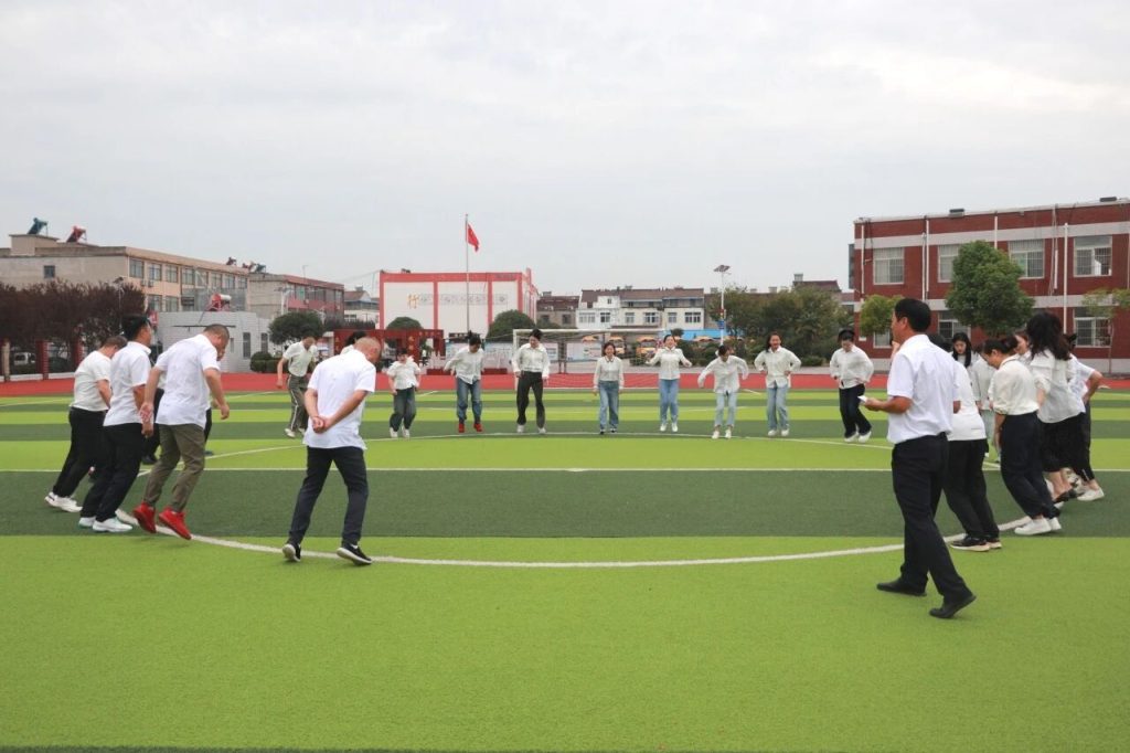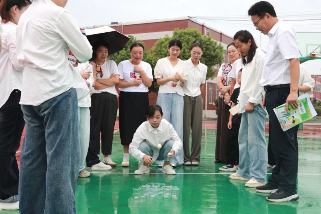 ~ 随后,趣味游戏环节在操场热闹开启,三个精心设计的游戏项目让现场充满欢声笑语。先是听口令跳圈圈,老师们根据指令快速反应,在足球场中心圈圈间灵活跳跃,考验反应力与协调性的同时,也唤起了童年的乐趣。乒乓球弹弹在专注与耐心的比拼中,展现出教师们细致严谨的一面。在圈速夺瓶战中,老师们瞄准目标迅速出手,精准抓住水瓶的瞬间,让现场掌声与欢呼声此起彼伏,充分释放了工作压力。