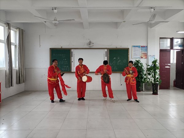 ~ 非遗传承人李圣青详细阐述了凉亭锣鼓这项非遗文化的文化内涵,与音乐老师探讨如何筛选学生及所需的器材、服装。最后由非遗文化传承人四位老师现场才艺展示。