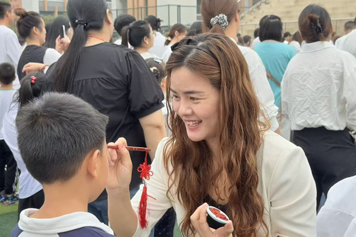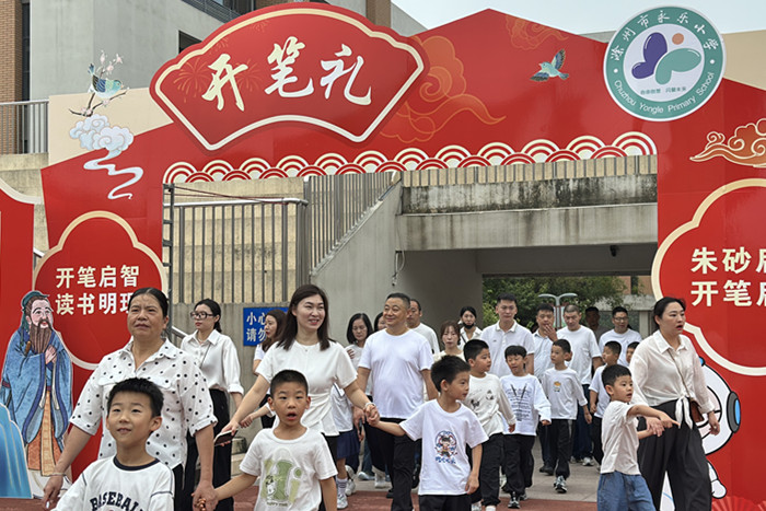 ~ 上午八点半,一年级新生在家长与老师的陪伴下走过“启智门”,迈入人生新阶段。庄严的升旗仪式后,该校党总支书记姚杰发表了热情洋溢的致辞:亲爱的家长朋友们,感谢你们把最珍贵的孩子托付给我们。孩子的成长需要“同向同频的爱”,多一些“看见”——看见努力比看见分数更重要;多一些“陪伴”——陪他读一页书、走一段路、聊一件小事;多一些“放手”——让孩子在尝试中学会选择,在选择中学会负责。学校将与您携手同行,用耐心、专业与温度,守护每一个独一无二的童年。接着,依次进行正衣冠、开笔写“人”、朱砂启智、新生家长代表发言环节。古代读书人以击鼓明志,盼着“金榜题名”!今天的新生在校长方笠三声响亮的鼓声引领下齐明志向。教师亮相、礼谢亲师、拜亲仪式陆续登场。最后,活动在新生集体诵读《弟子规》声中圆满落下帷幕。朗朗书声回荡在校园上空,中华经典的智慧种子悄然播撒在心田,优秀传统文化的血脉在此刻传承。