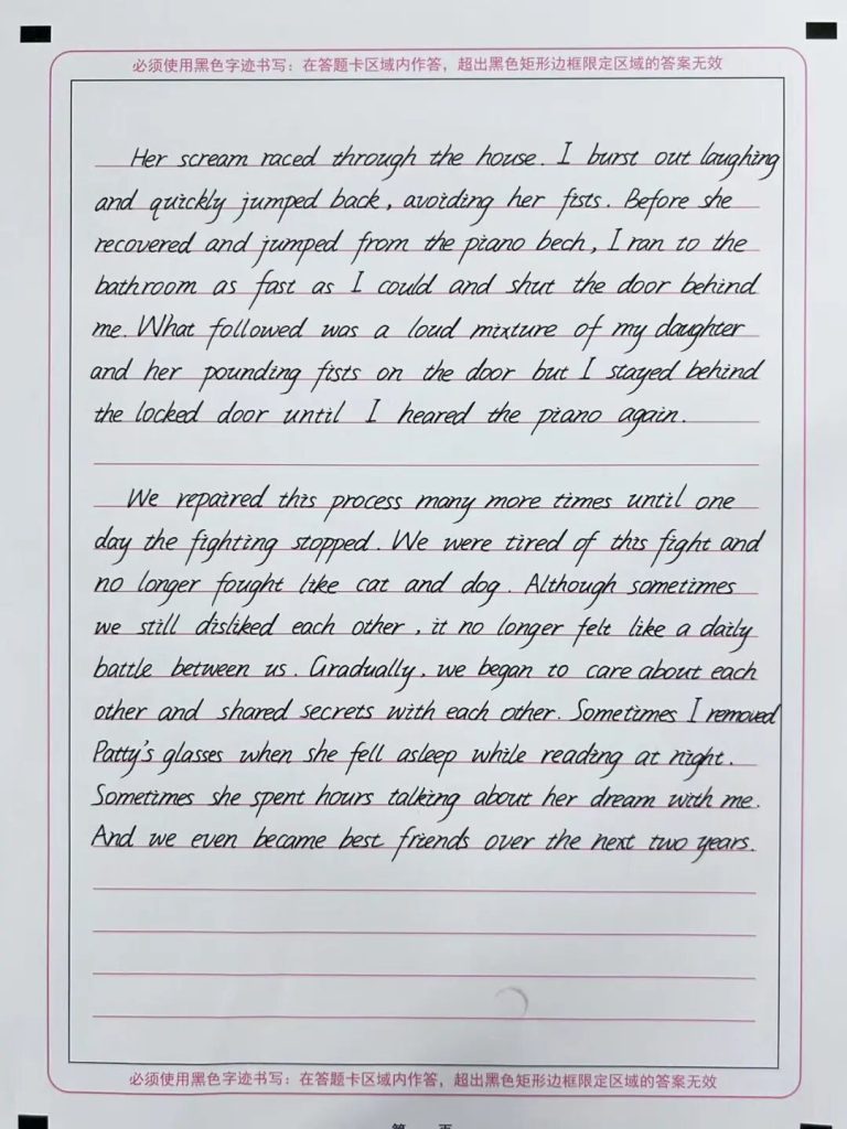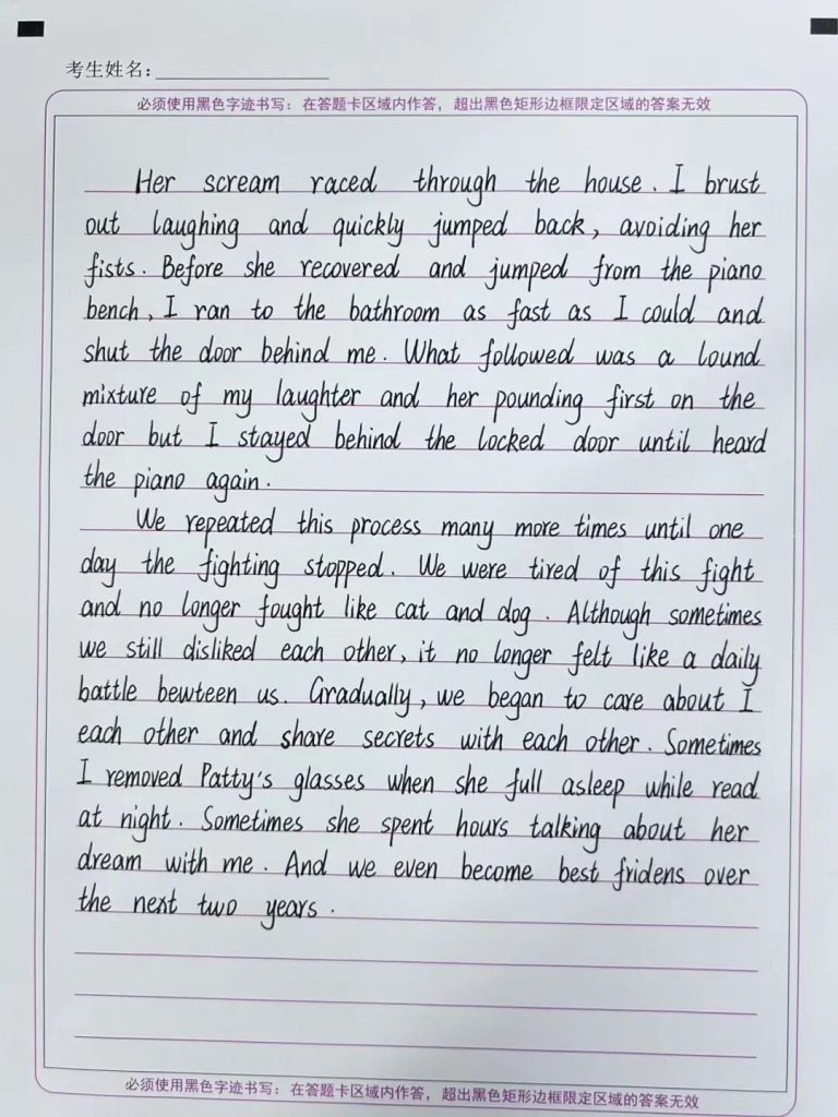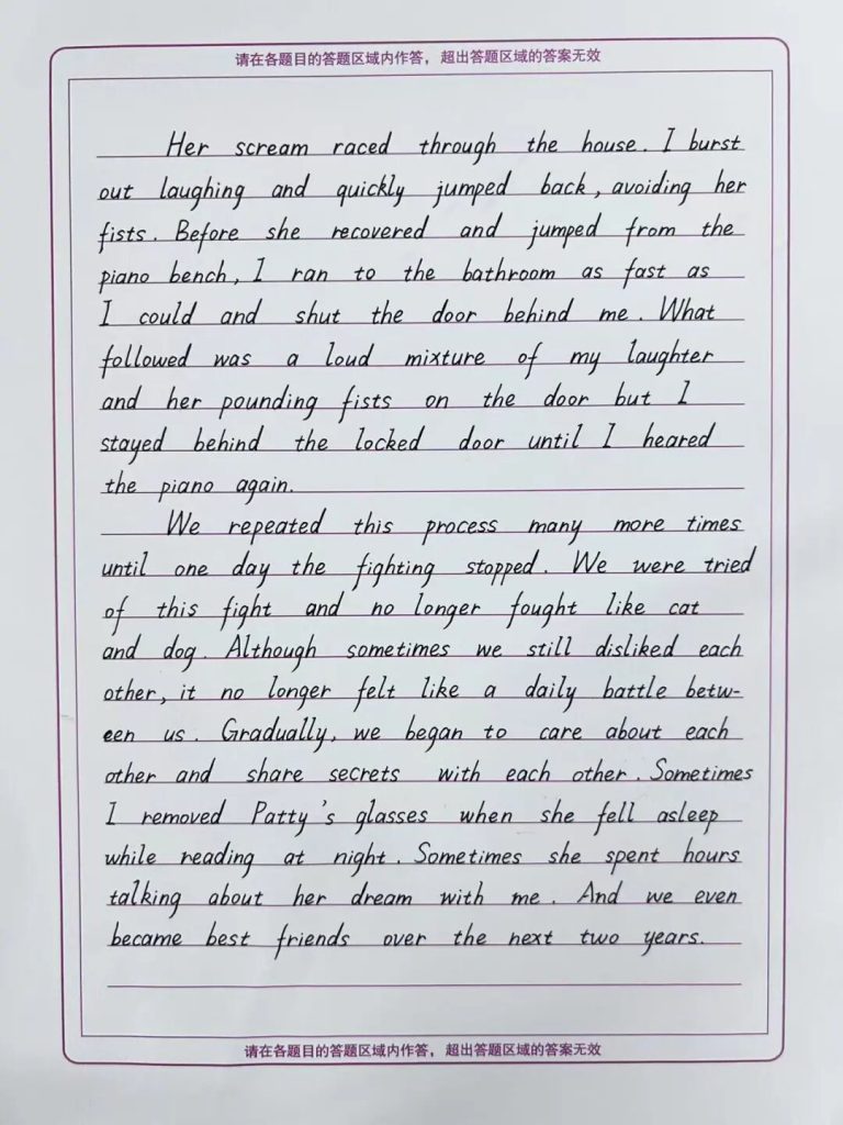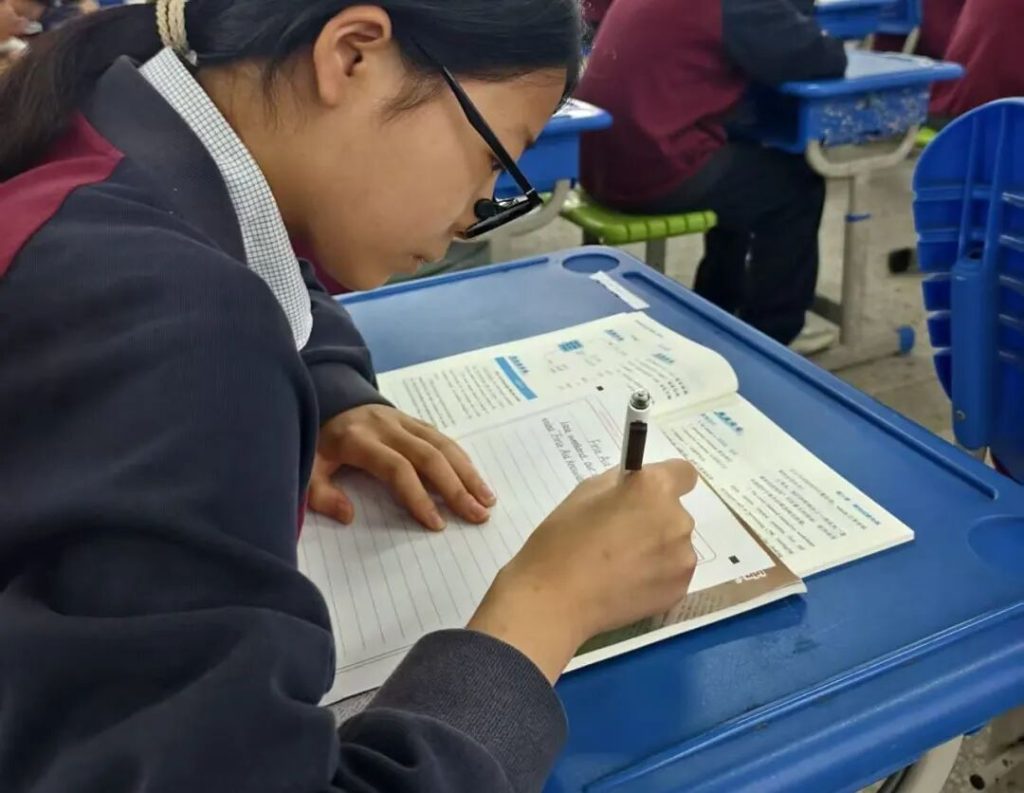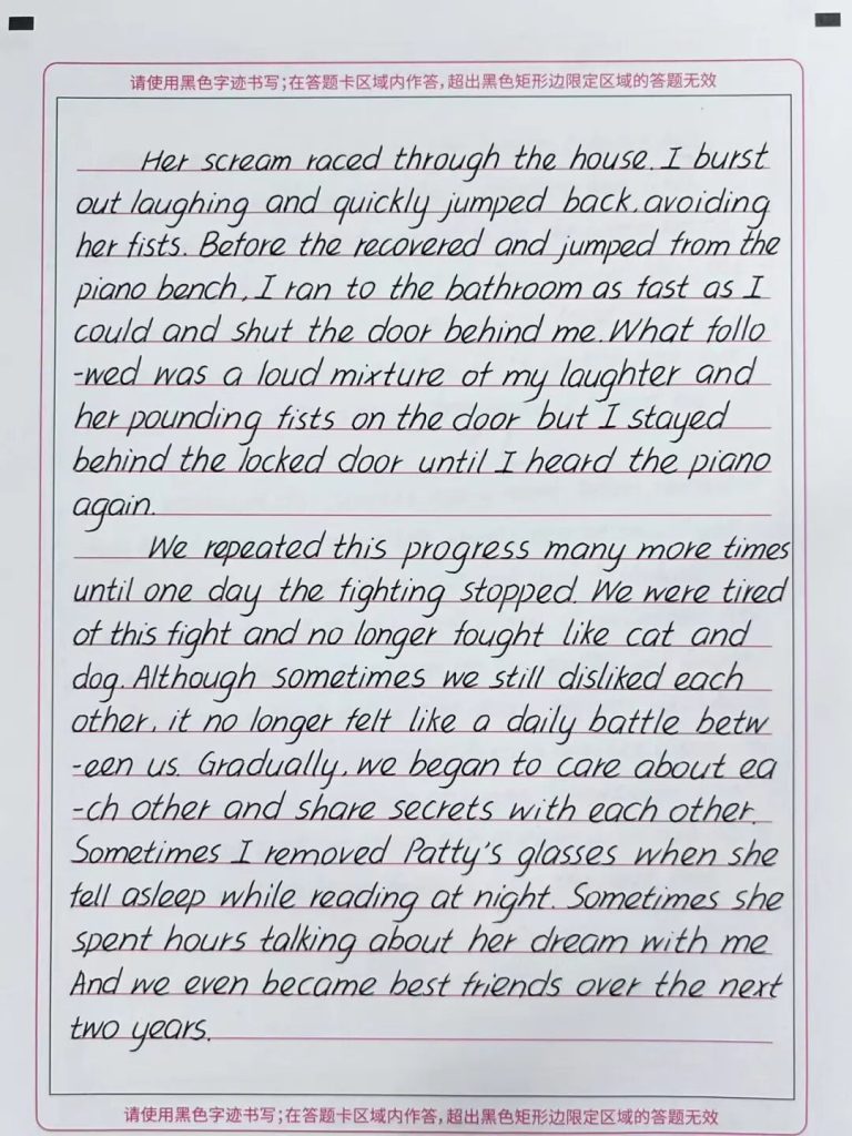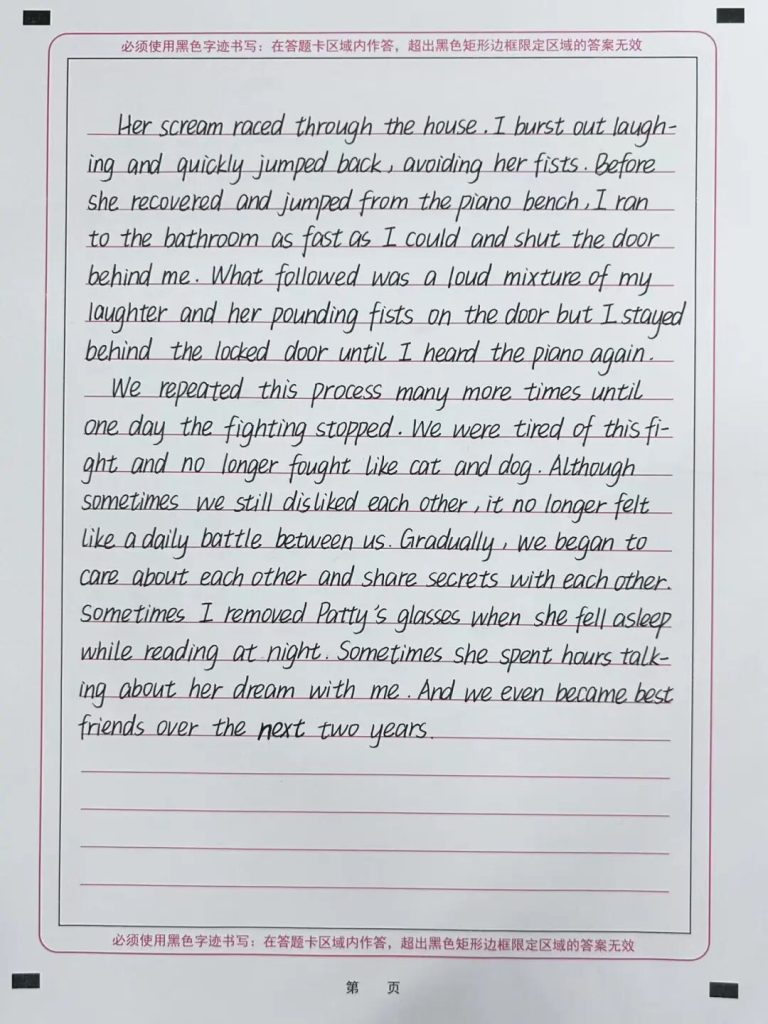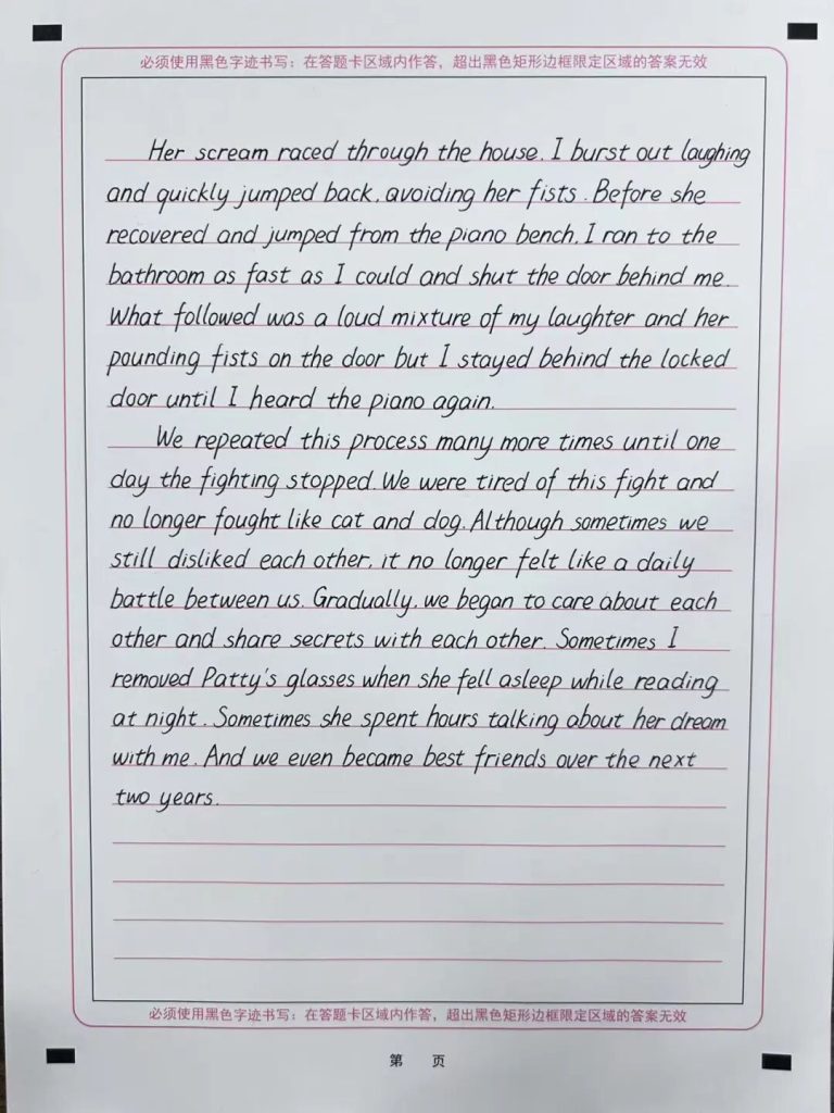 ~ 决赛现场,选手们坐姿端正、神情专注。有的轻握钢笔,笔尖在纸上流畅游走,写下娟秀工整的斜体字母;有的以清晰有力的印刷体呈现经典英文句子;还有同学用灵动的笔画搭配巧妙的排版,让平凡的文字焕发出艺术气息。此次比赛以“Colorful Letters, Bright Voices”为主题,选手们根据要求的选文内容,将对语言的热爱与对生活的感悟融入每一个字符。