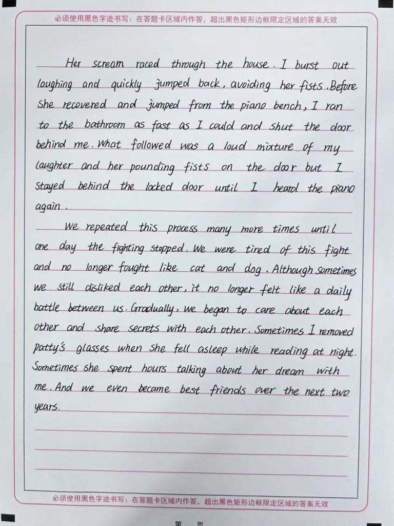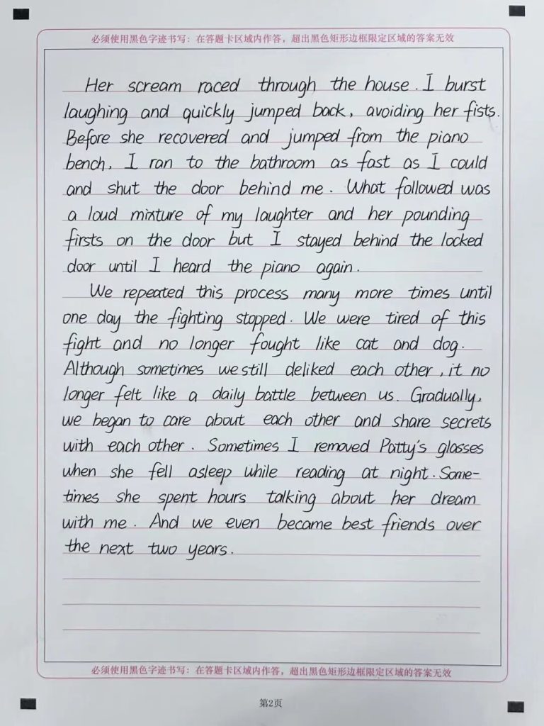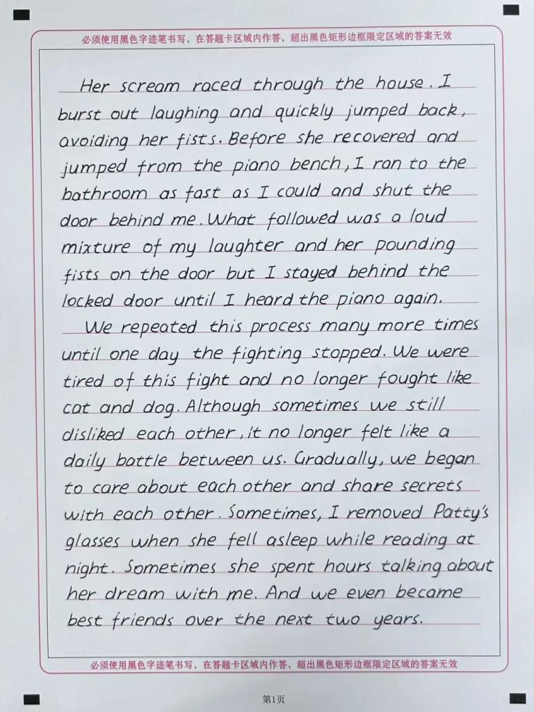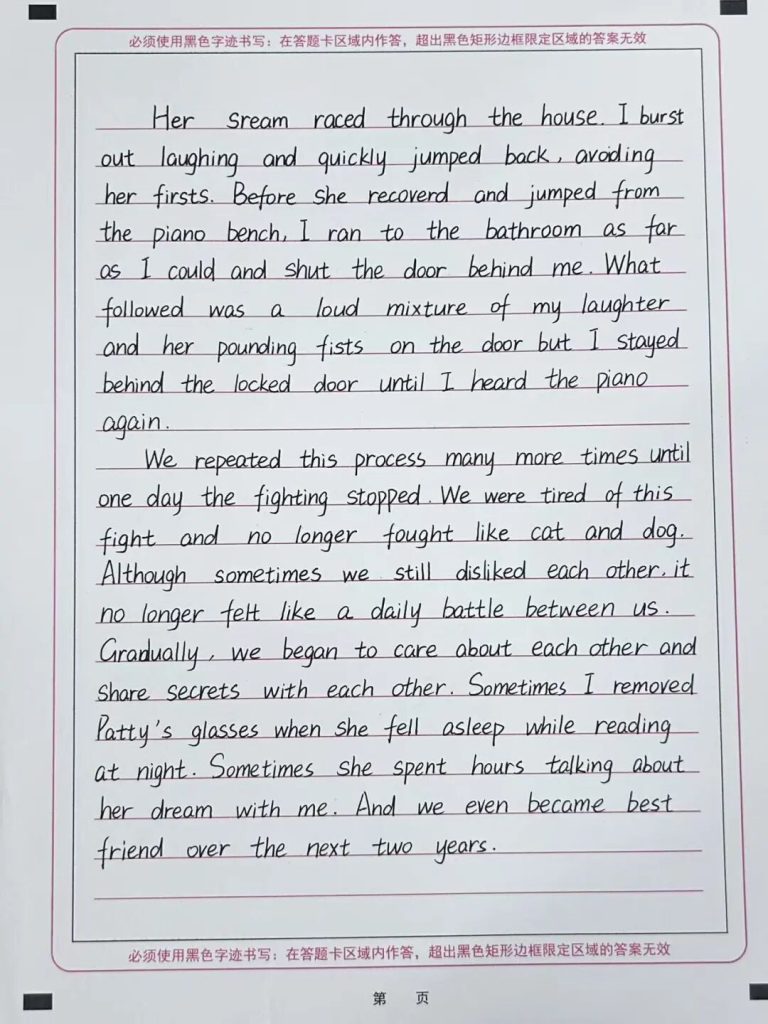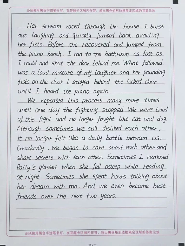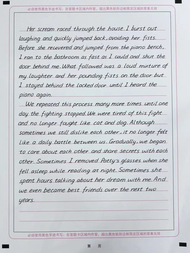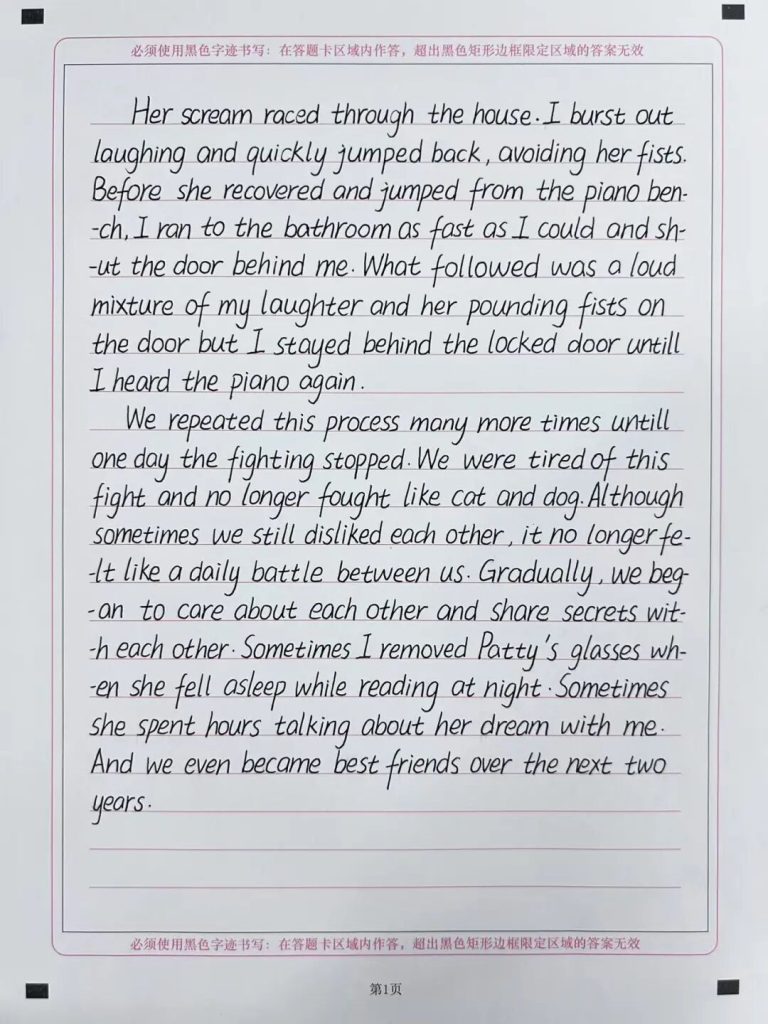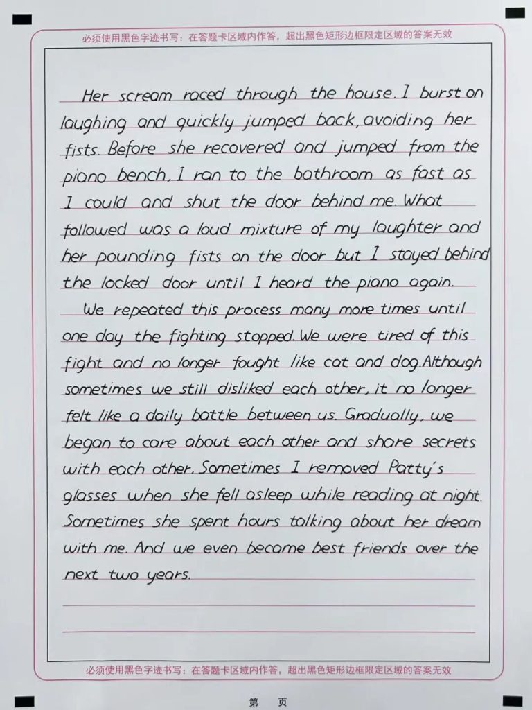 ~ 决赛现场,选手们坐姿端正、神情专注。有的轻握钢笔,笔尖在纸上流畅游走,写下娟秀工整的斜体字母;有的以清晰有力的印刷体呈现经典英文句子;还有同学用灵动的笔画搭配巧妙的排版,让平凡的文字焕发出艺术气息。此次比赛以“Colorful Letters, Bright Voices”为主题,选手们根据要求的选文内容,将对语言的热爱与对生活的感悟融入每一个字符。