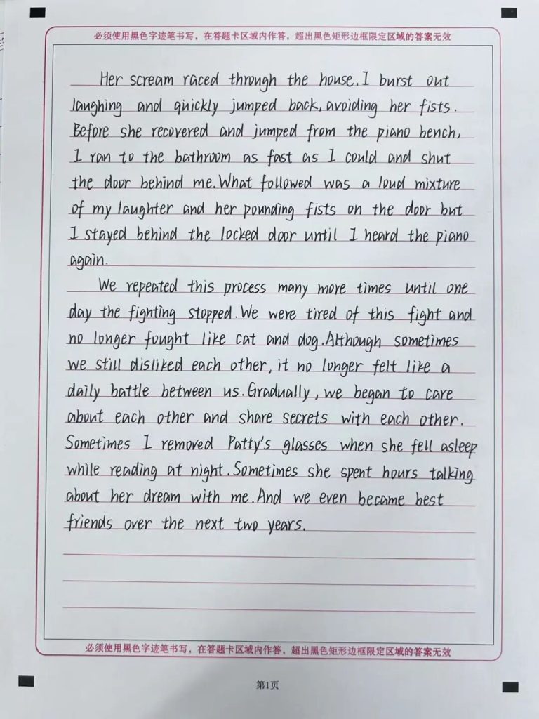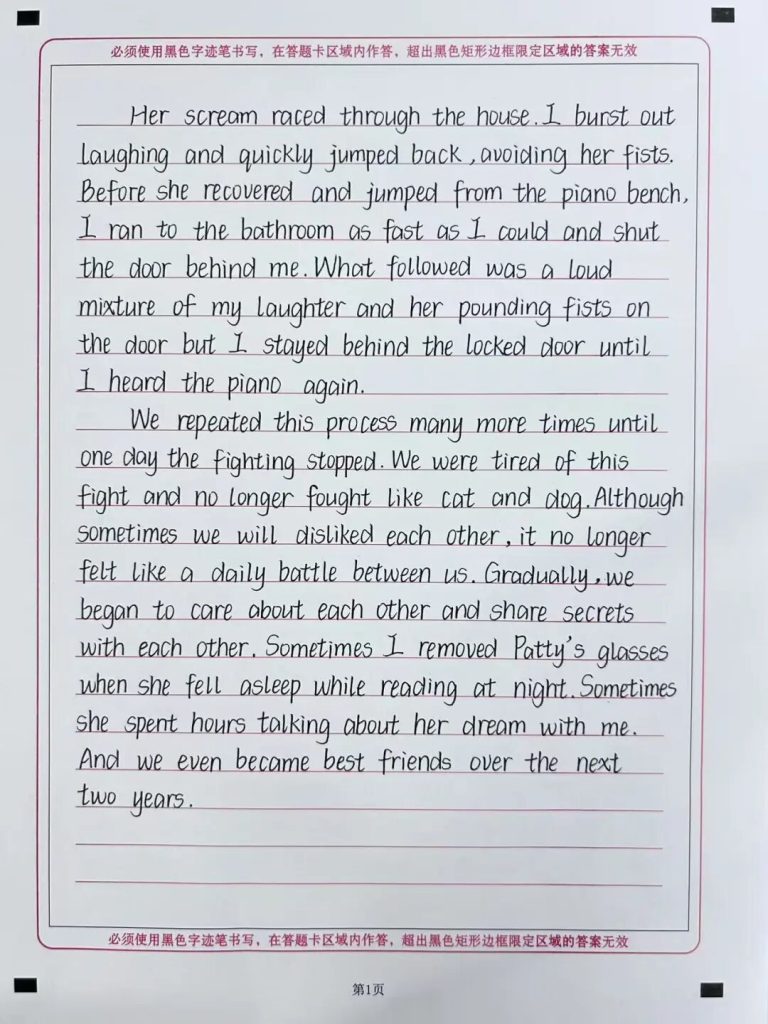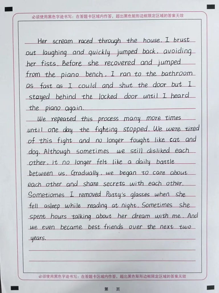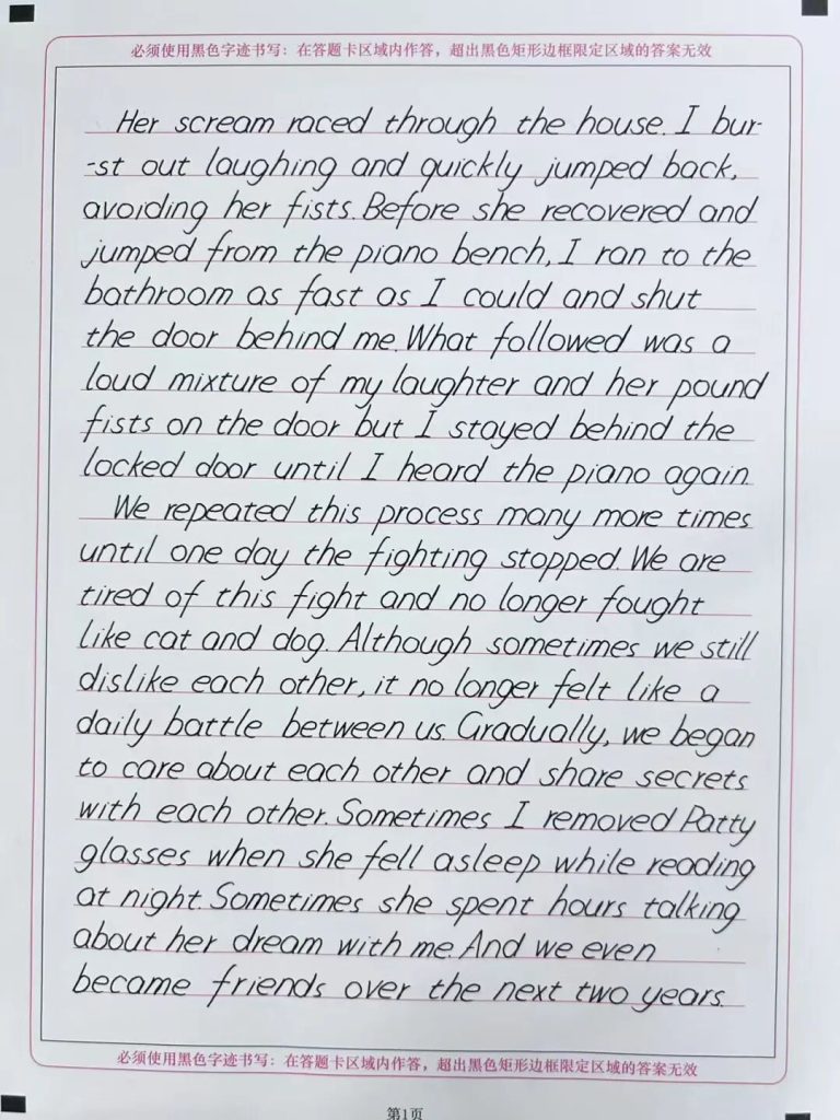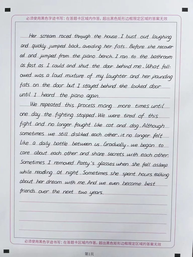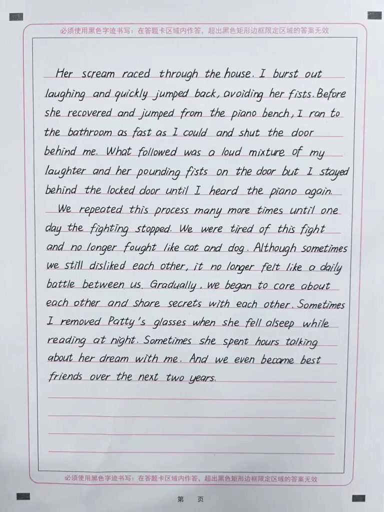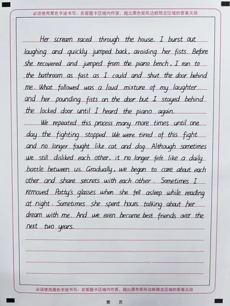 ~ 决赛现场,选手们坐姿端正、神情专注。有的轻握钢笔,笔尖在纸上流畅游走,写下娟秀工整的斜体字母;有的以清晰有力的印刷体呈现经典英文句子;还有同学用灵动的笔画搭配巧妙的排版,让平凡的文字焕发出艺术气息。此次比赛以“Colorful Letters, Bright Voices”为主题,选手们根据要求的选文内容,将对语言的热爱与对生活的感悟融入每一个字符。