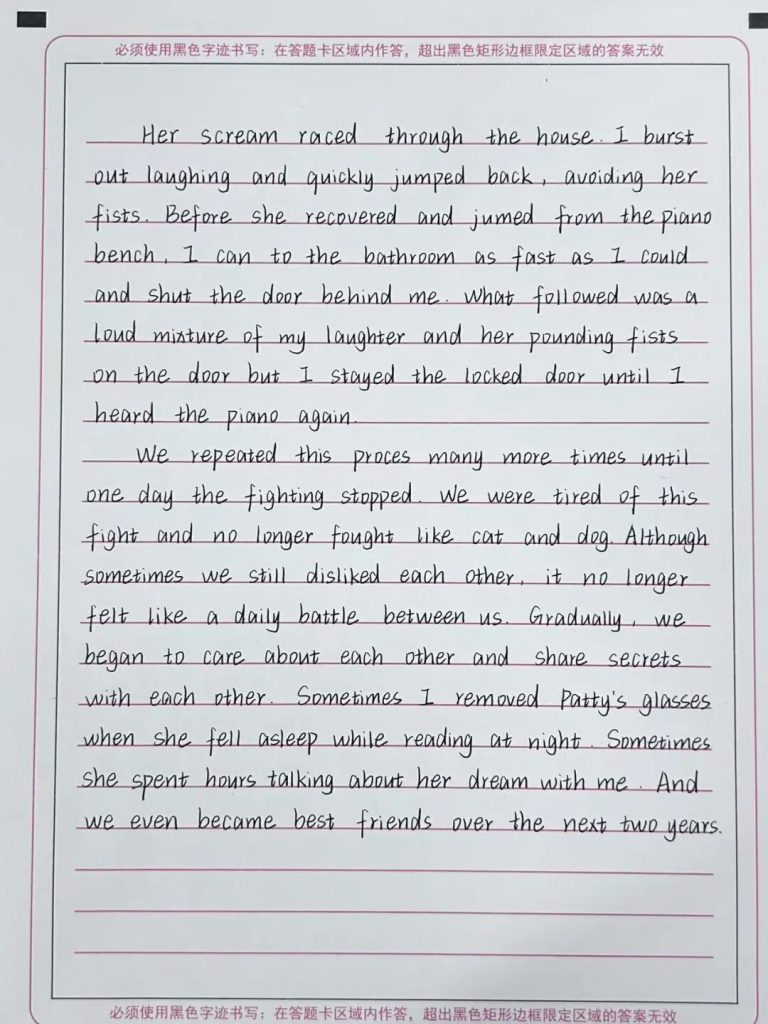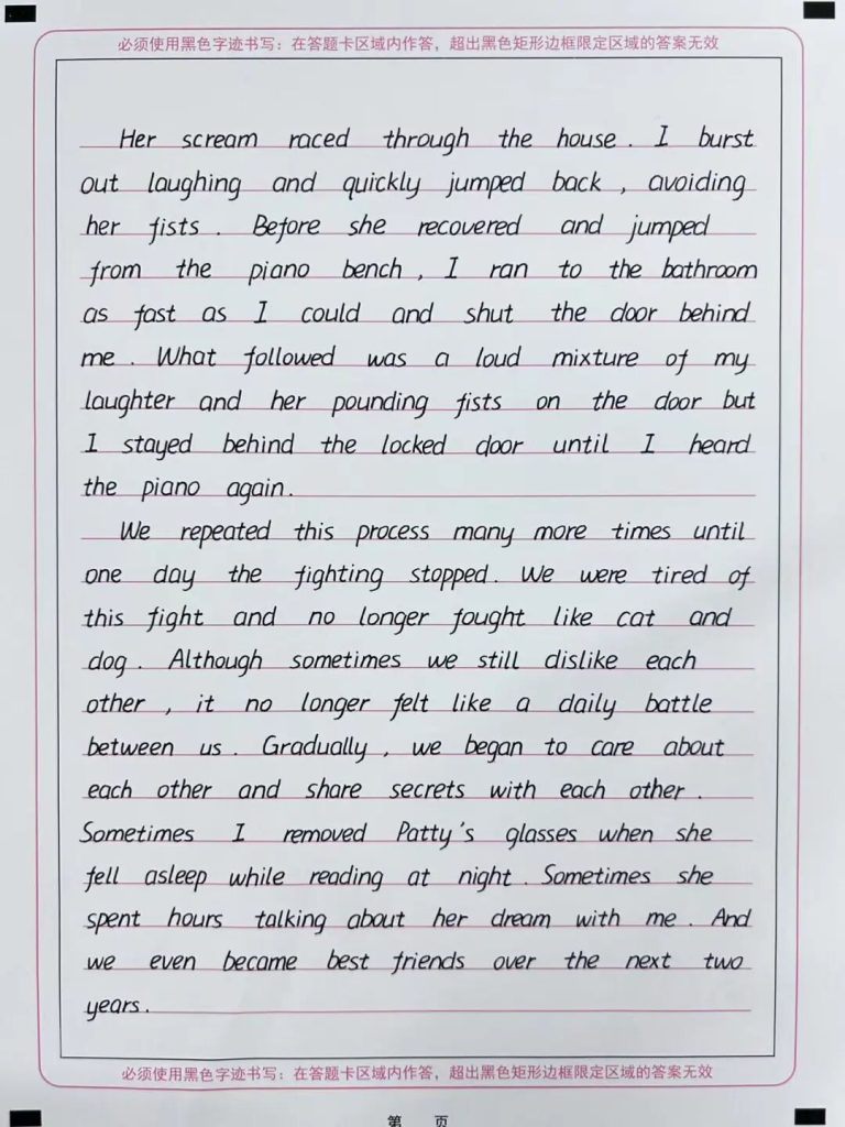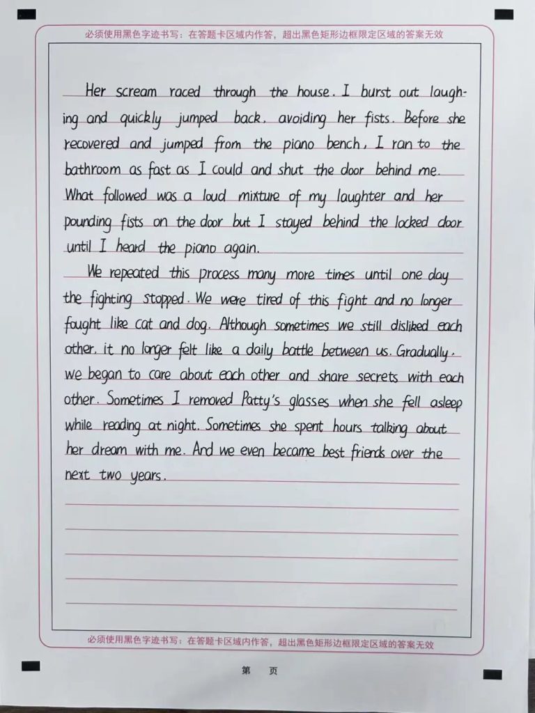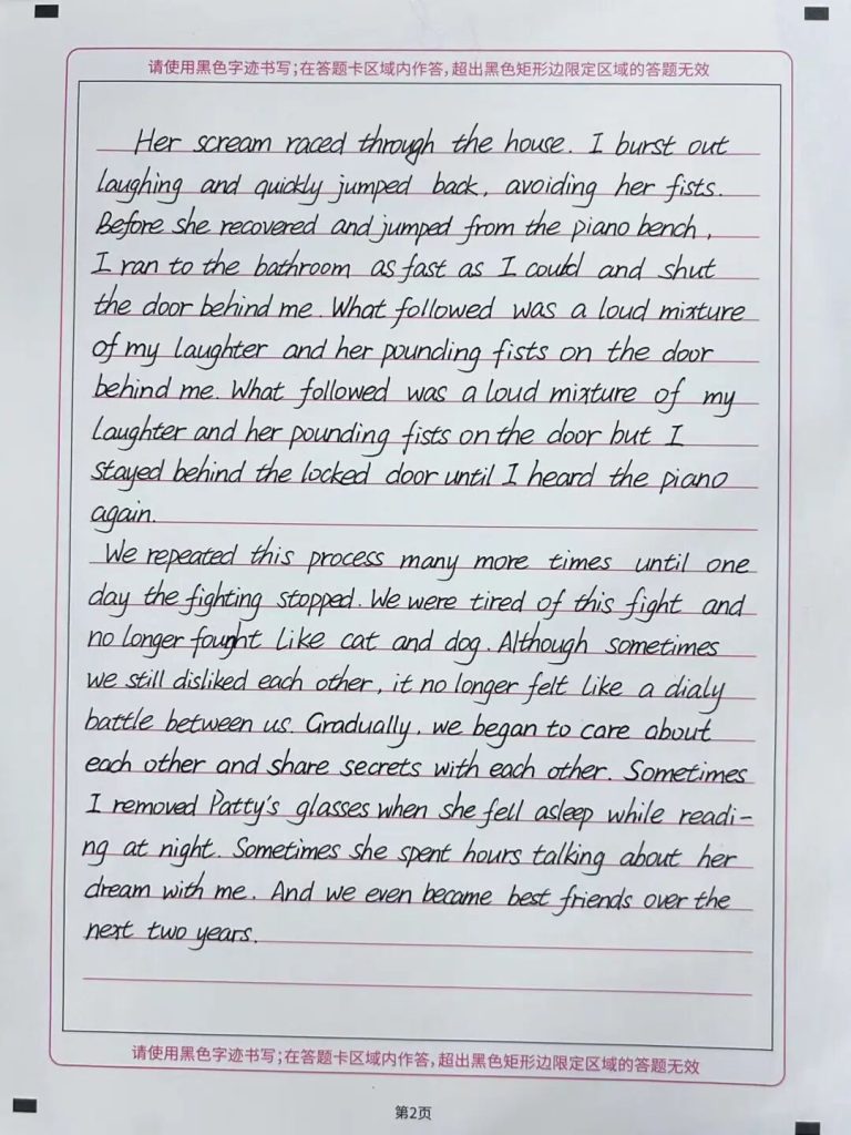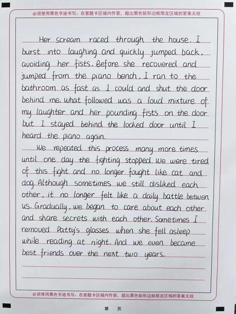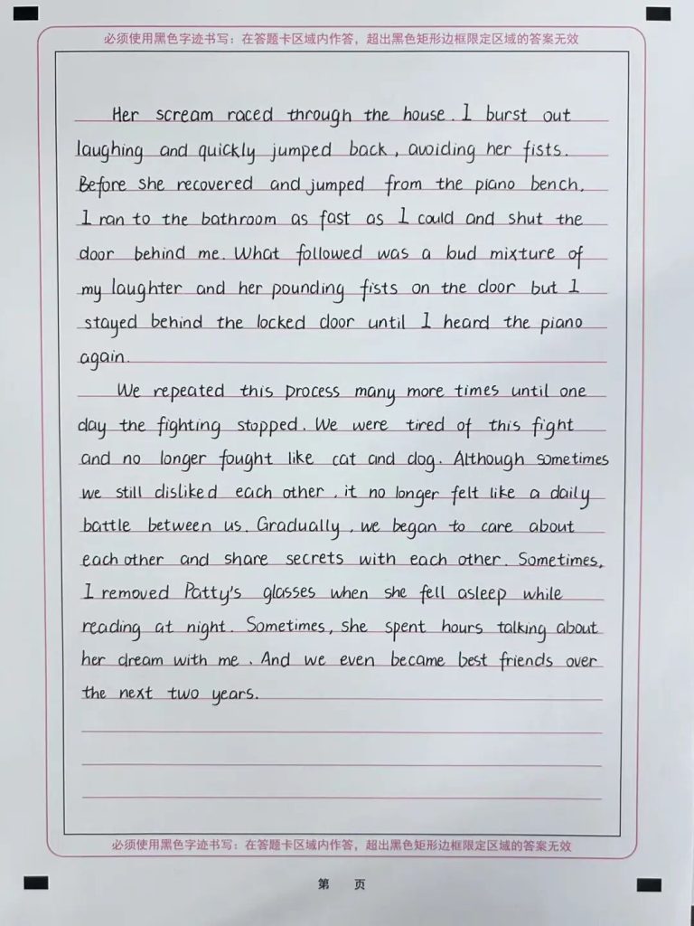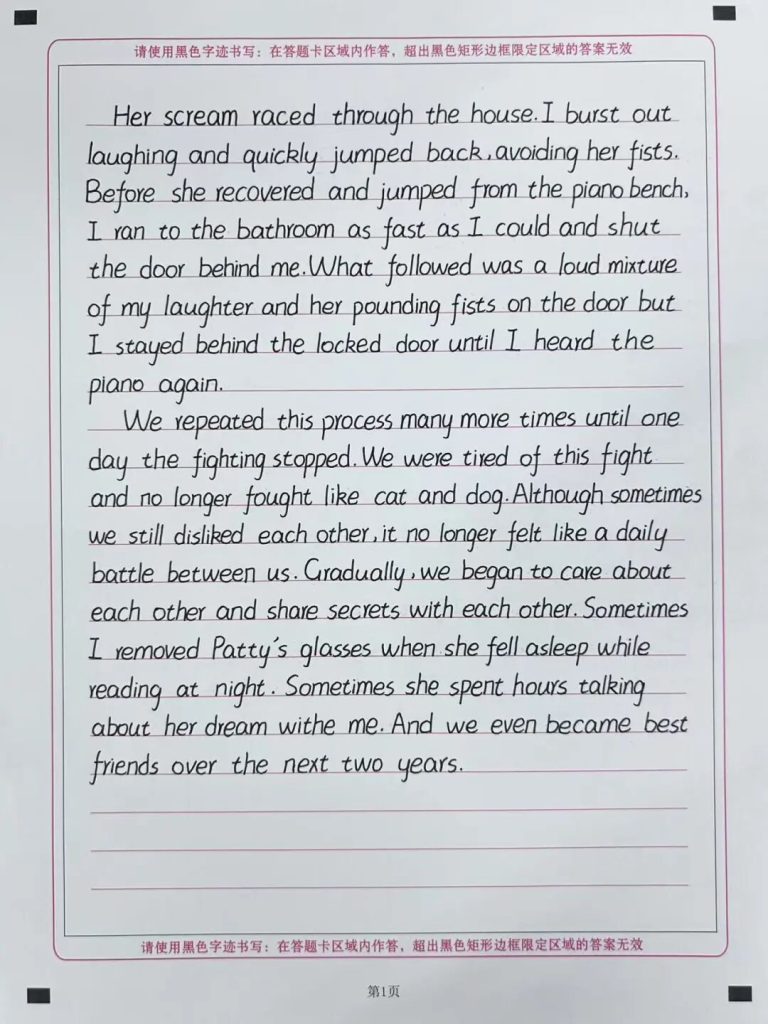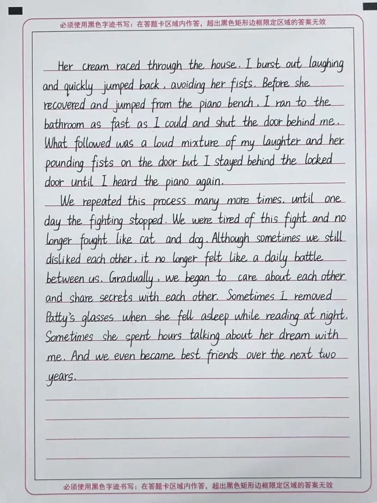 ~ 决赛现场,选手们坐姿端正、神情专注。有的轻握钢笔,笔尖在纸上流畅游走,写下娟秀工整的斜体字母;有的以清晰有力的印刷体呈现经典英文句子;还有同学用灵动的笔画搭配巧妙的排版,让平凡的文字焕发出艺术气息。此次比赛以“Colorful Letters, Bright Voices”为主题,选手们根据要求的选文内容,将对语言的热爱与对生活的感悟融入每一个字符。