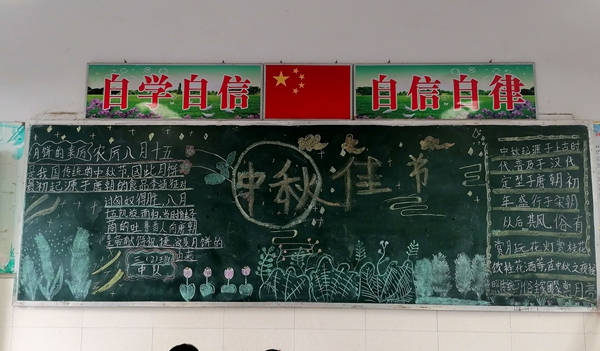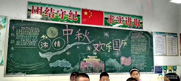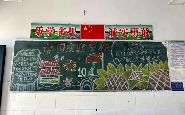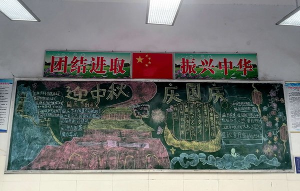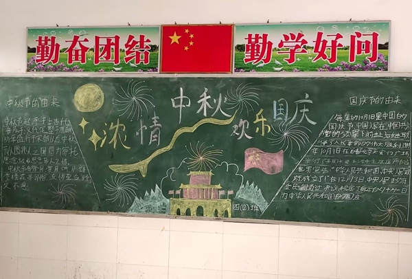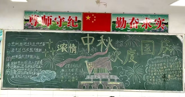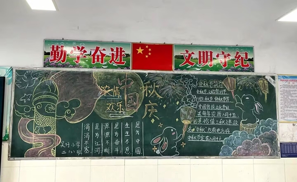 ~ 活动中,在老师的指导下,同学们分工合作,有的查阅国庆、中秋相关知识,有的设计版面构图,有的书写主题。黑板上,鲜艳的五星红旗与皎洁的明月相映成趣,“欢度国庆”“中秋团圆”等字样醒目亮眼,嫦娥奔月、天安门等图案生动形象,还配上了爱国诗句、中秋习俗介绍等内容,既展现了传统节日的魅力,又传递了浓厚的家国情怀。