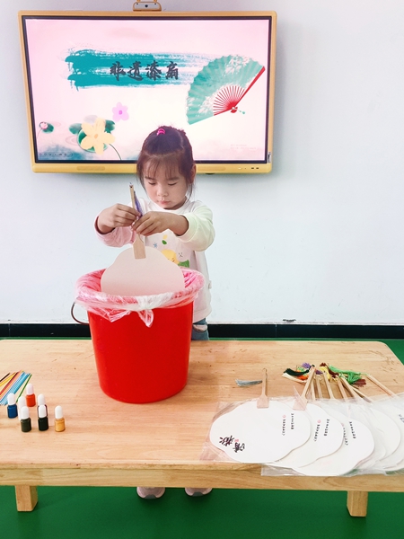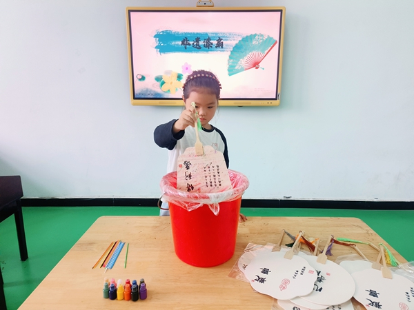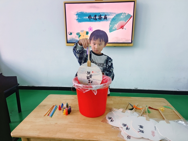 ~ 小朋友们先通过老师的讲解了解漆扇工艺的制作过程,在老师们的耐心示范和一对一指导下选取自己喜欢的漆色开始动手,他们小心翼翼地挑选着自己喜爱的颜色,那专注的神情,仿佛在调配月光与秋色。每一个步骤,孩子们都做得有模有样。当小手轻轻转动扇柄,看着色彩在水面与扇面之间绽放、交融,形成一幅幅独一无二的“月光星河”或“团圆画卷”时,孩子们脸上洋溢出的成就感与喜悦,是活动中最动人的风景。