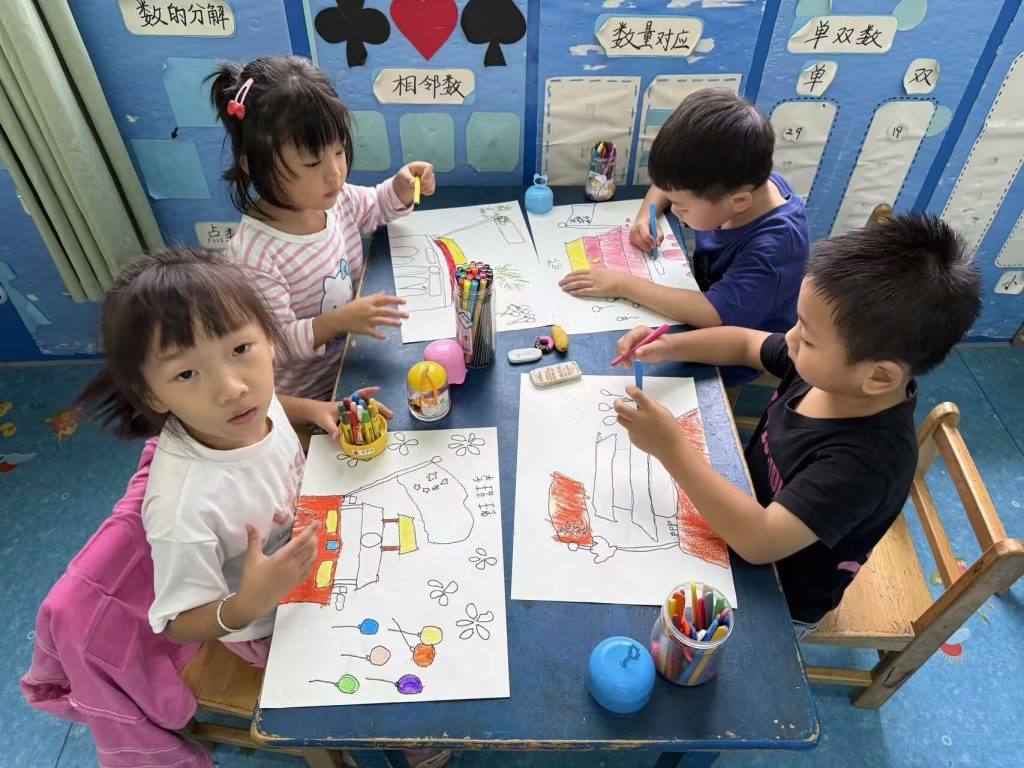 ~ 活动当天,幼儿园里处处洋溢着喜庆祥和的节日气氛。在“小小画笔绘祖国”环节,孩子们用稚嫩的小手和五彩的颜料,在画纸上描绘出天安门、国旗、月饼、玉兔等图案,一幅幅充满童趣的画作,表达了他们对祖国的热爱和对团圆的美好祝愿。