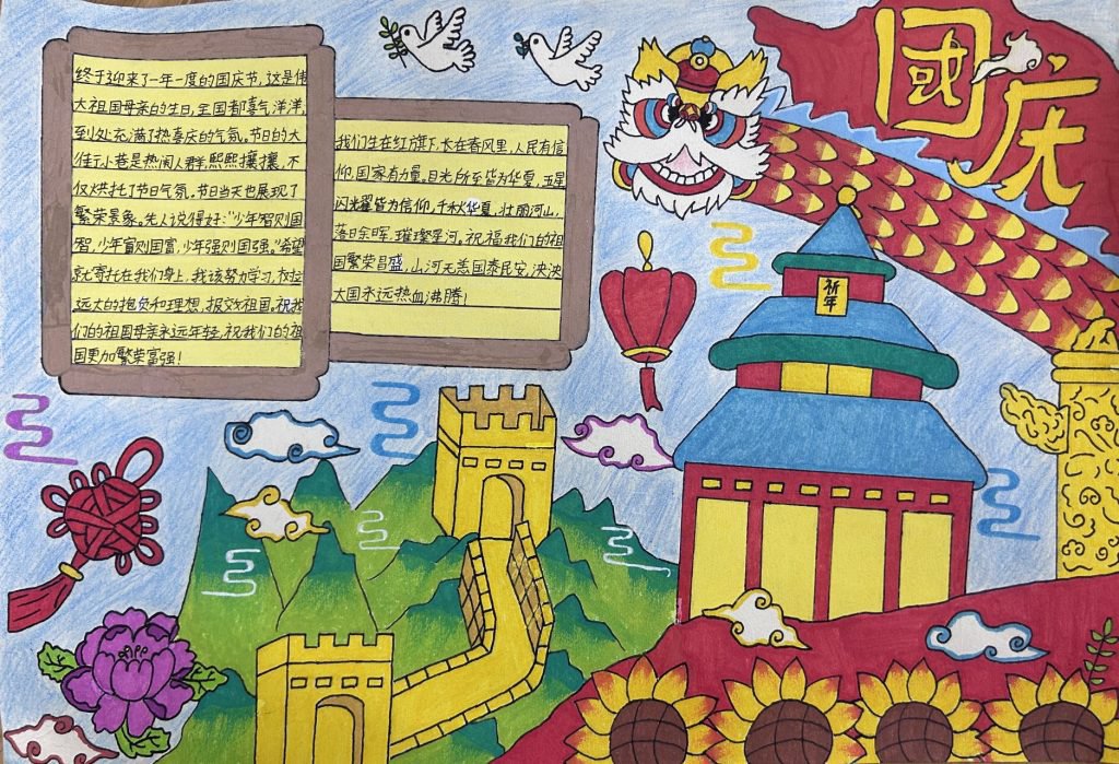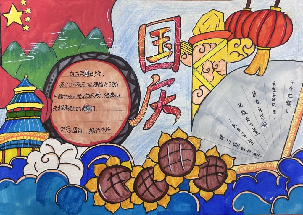 ~ 活动中,学子们以笔为媒,用手抄报勾勒祖国发展印记——鲜艳的五星红旗、壮丽的山河图景、鲜活的爱国故事跃然纸上,每一笔色彩都饱含对祖国的祝福。