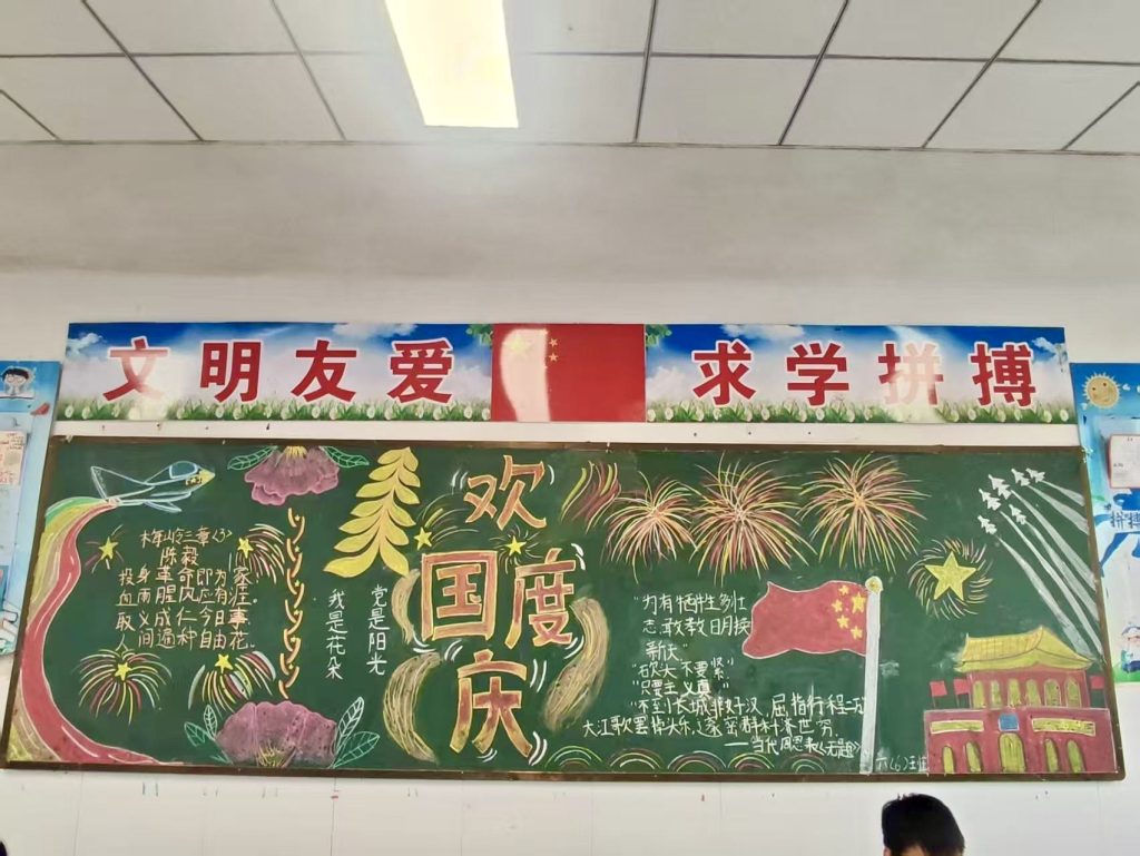 ~ 各班级师生共同参与黑板报创作,从“祖国辉煌历程”到“新时代新成就”,图文并茂的内容成为校园里鲜活的“爱国课堂”。