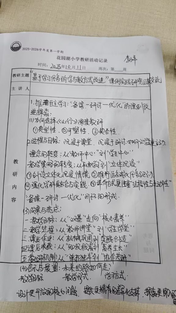 ~ 本次活动由安徽省教育科学研究院周玲开场,高虎主持,分“课例实践研究汇报交流”“新课标校本行动教研策划与实施汇报交流”两大板块展开。在课例实践与教研机制分享环节,淮北市烈山区实验学校“备课—研讨—优化”课例改进探索、宿州市砀山县师范附属小学跨学科教学新路径等分享,共同勾勒出皖北地区小学语文教研的多元实践图谱。 据了解,花园湖小学教研团队的“善智课堂四维打磨”教研模式,即以“集体备课定框架—试讲磨课抠细节—校园公开课验效果—评课议课攒经验”与省级最前沿教研模式:研学磨教的教研机制不谋而合。