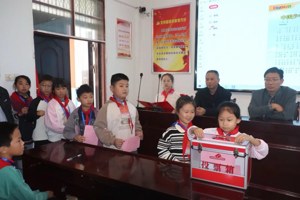 ~ 上届大队委回顾了学校少先队工作一年来取得的累累硕果。随后,主持人宣读了大队委员选举的方法、监票人、计票人名单。3名大队委候选人通过竞选演讲的方式依次进行现场竞选拉票,各少先队员代表庄重地投上了神圣的一票。