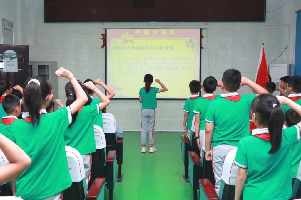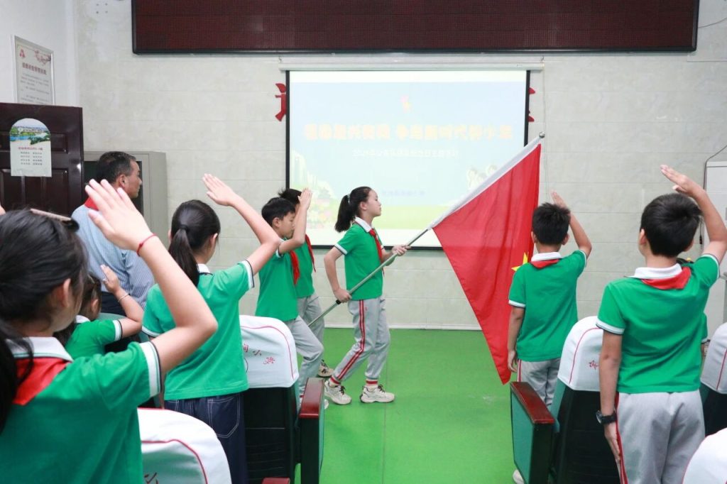 ~ 校长张道胜亲自为新建中队授旗,并寄语新队员:“希望你们以英雄模范为榜样,热爱祖国、勤奋学习,做有理想、有本领、有担当的新时代好队员!”新队员代表在发言中表示:“我们要牢记总书记的教导,从小学先锋、长大做先锋,为实现强国梦贡献力量!”