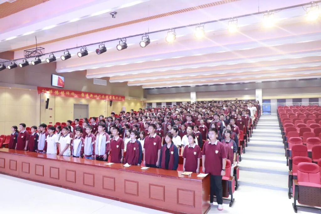 ~ 为庆祝中华人民共和国成立76周年,激励广大学子传承奋斗精神、担当时代使命,滁州凤阳英华中学开展庆祝中华人民共和国成立76周年系列活动。国庆节前夕,校团委组织在报告厅召开“传承红色基因,担当时代新人”主题思想政治课,活动现场气氛庄重热烈,全体同学接受了一次深刻的思想洗礼。