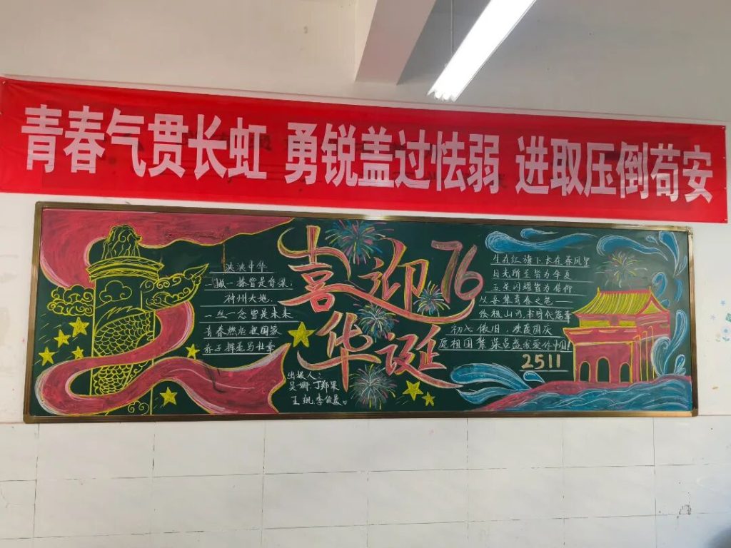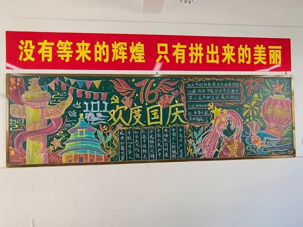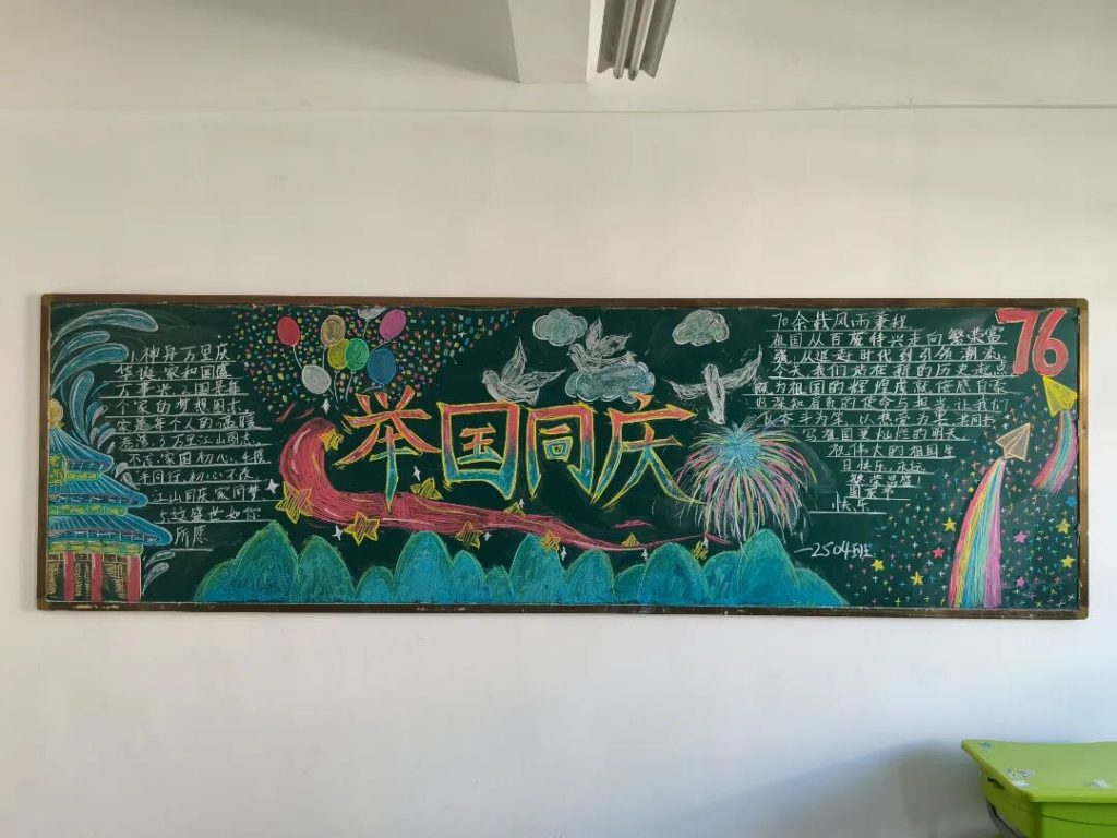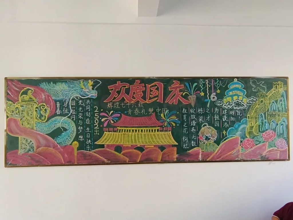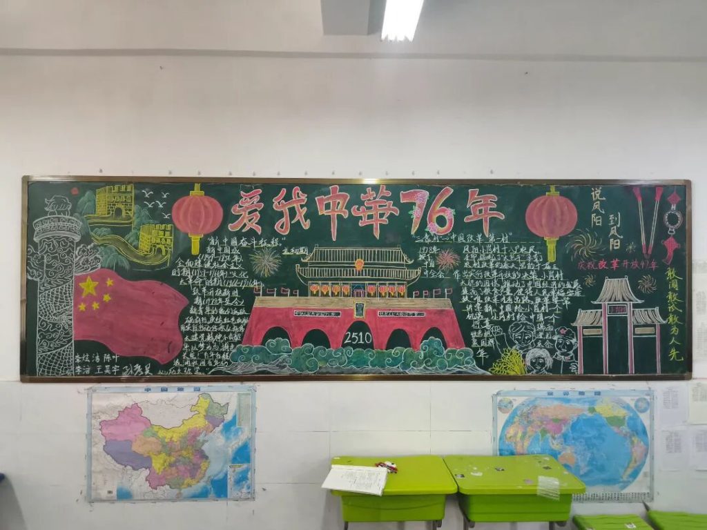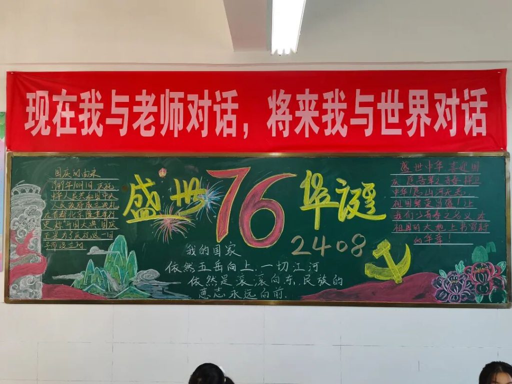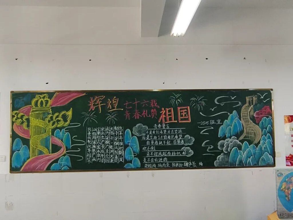 ~ 在庆祝中华人民共和国成立76周年之际,滁州凤阳英华中学组织开展”辉煌七十六载,青春礼赞祖国”主题黑板报评比活动。各班级积极响应,用粉笔绘就盛世图景,以方寸黑板抒发爱国情怀,营造了浓厚的庆祝氛围。
