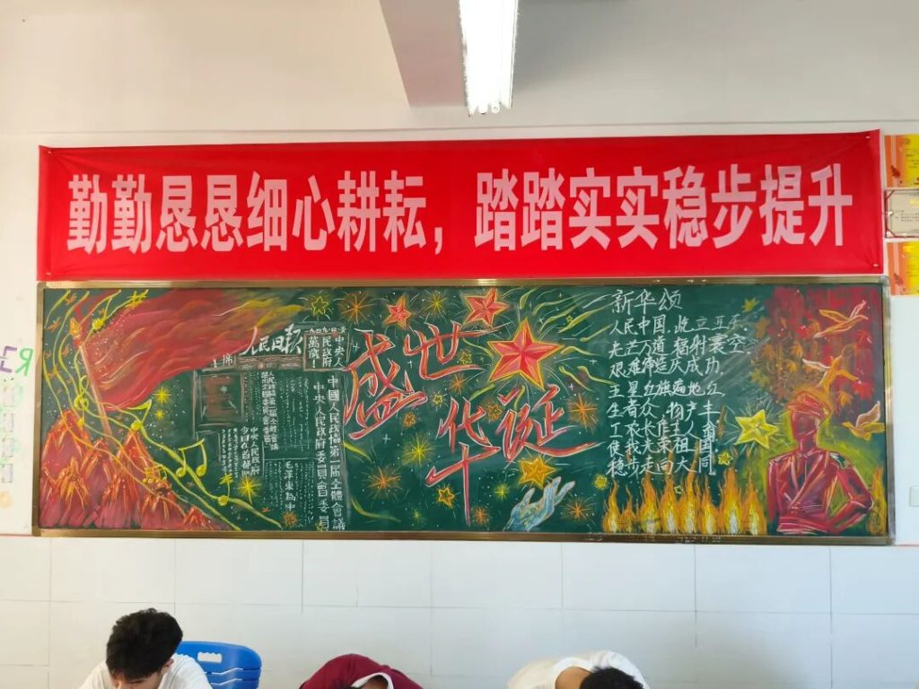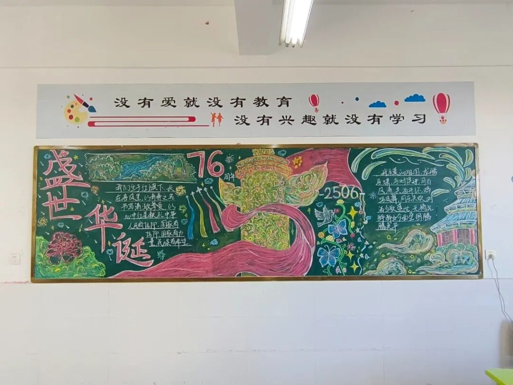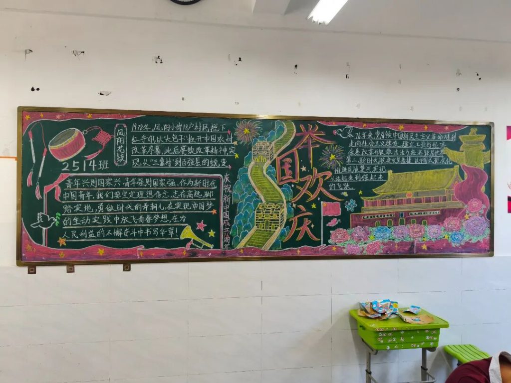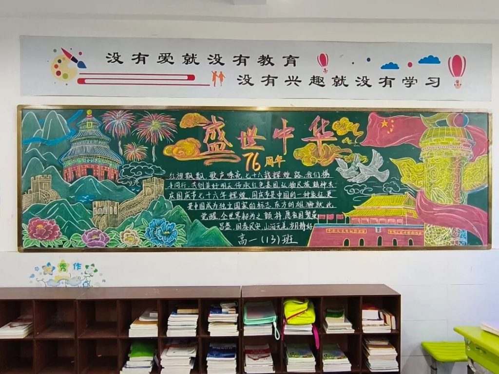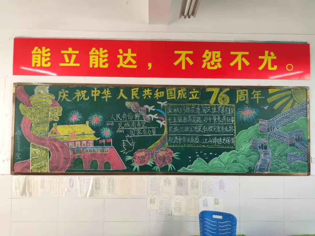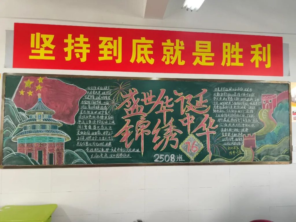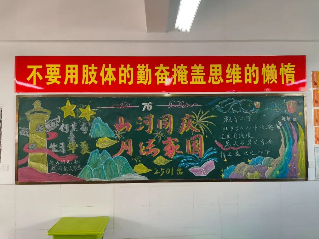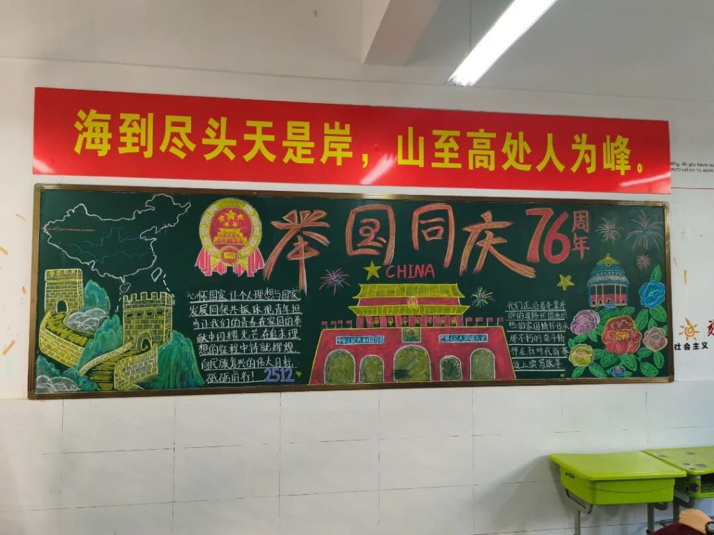 ~ 在庆祝中华人民共和国成立76周年之际,滁州凤阳英华中学组织开展”辉煌七十六载,青春礼赞祖国”主题黑板报评比活动。各班级积极响应,用粉笔绘就盛世图景,以方寸黑板抒发爱国情怀,营造了浓厚的庆祝氛围。