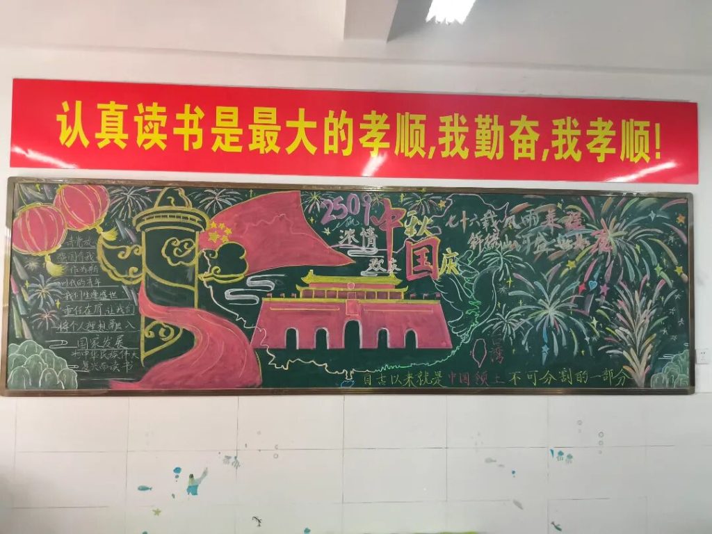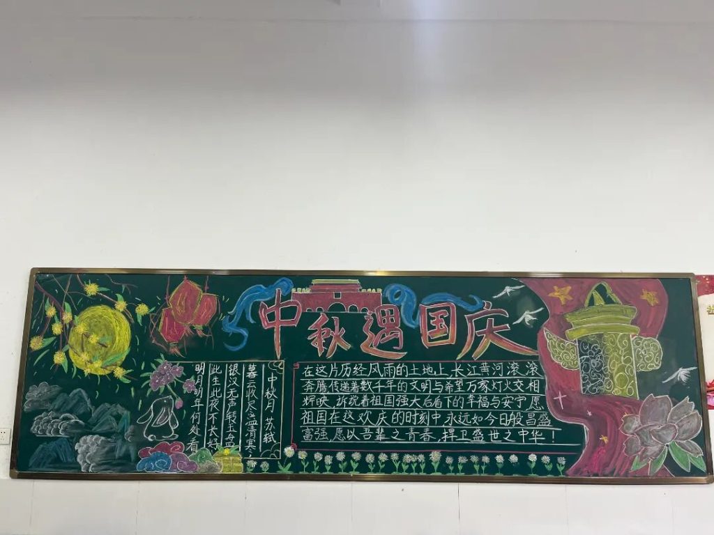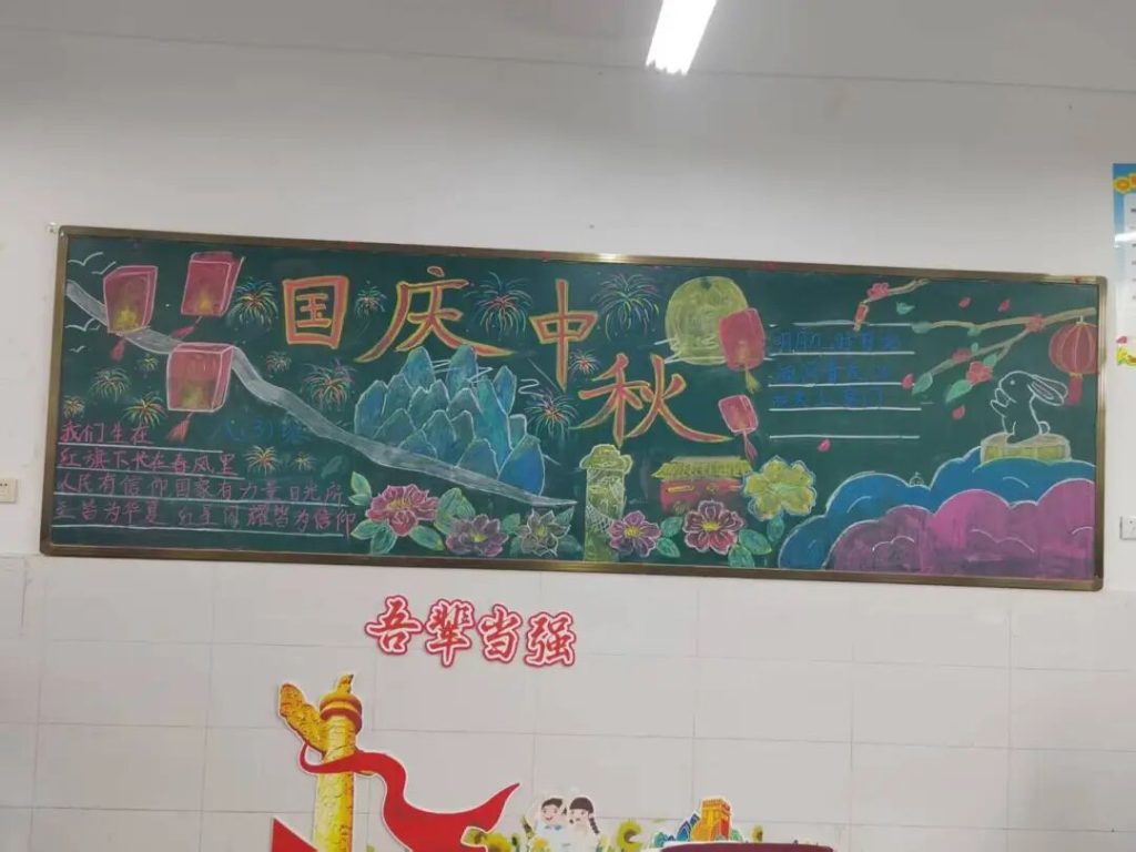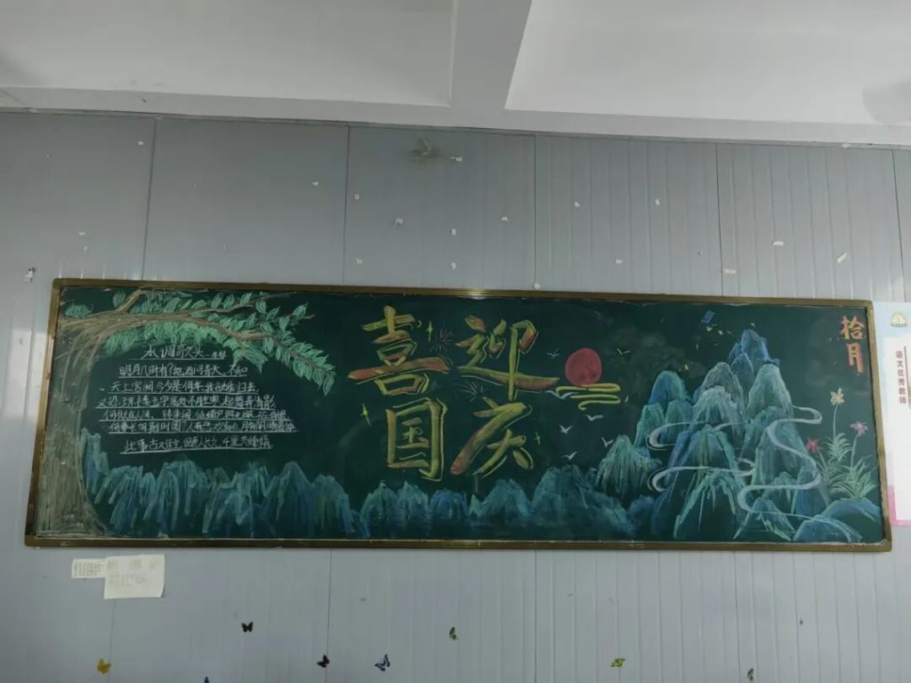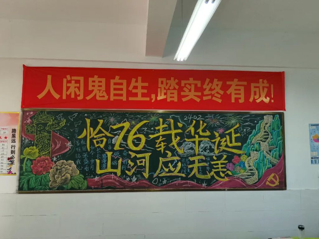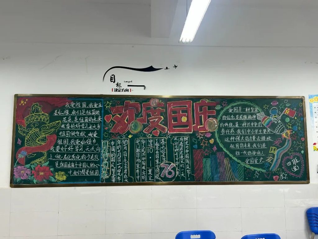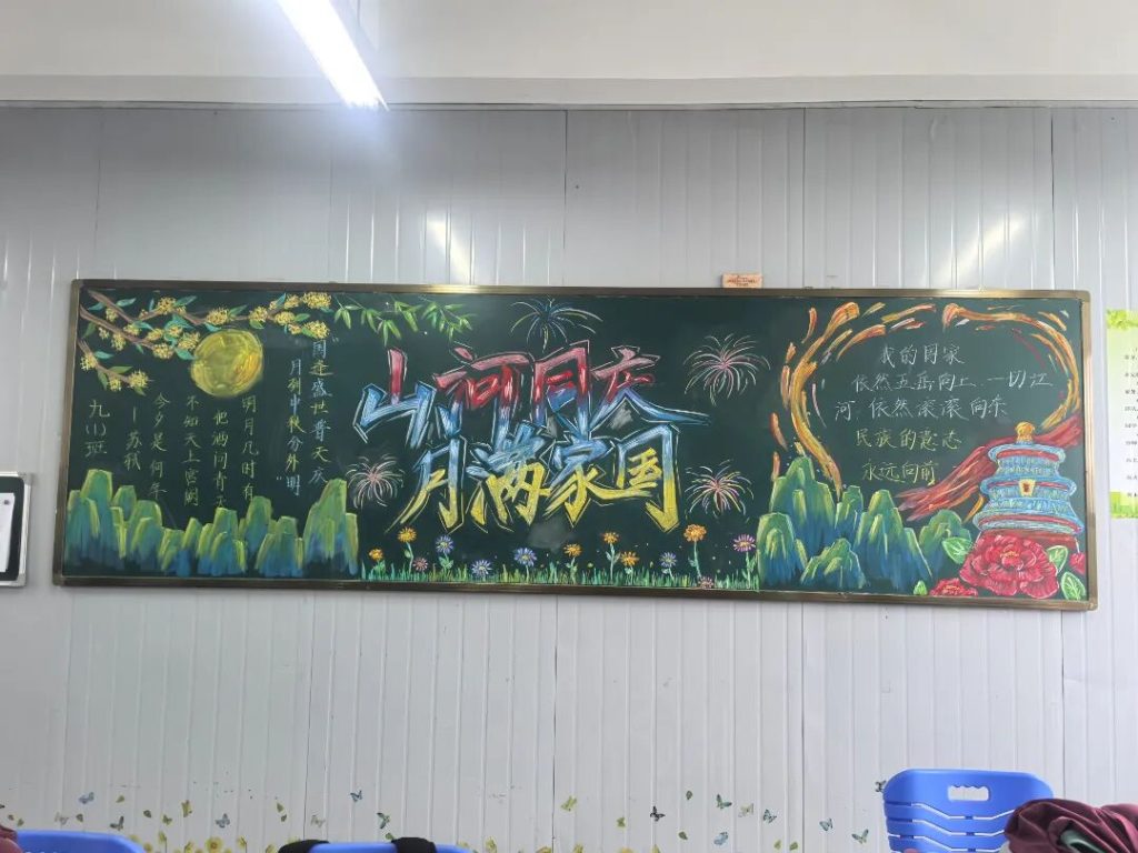 ~ 在庆祝中华人民共和国成立76周年之际,滁州凤阳英华中学组织开展”辉煌七十六载,青春礼赞祖国”主题黑板报评比活动。各班级积极响应,用粉笔绘就盛世图景,以方寸黑板抒发爱国情怀,营造了浓厚的庆祝氛围。