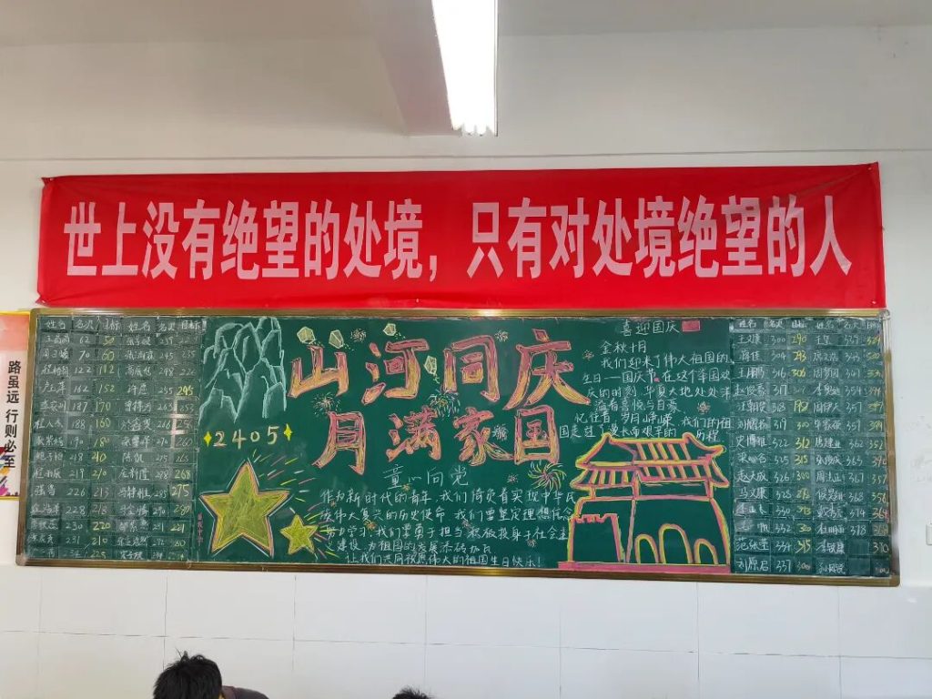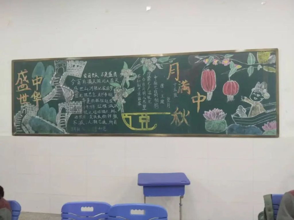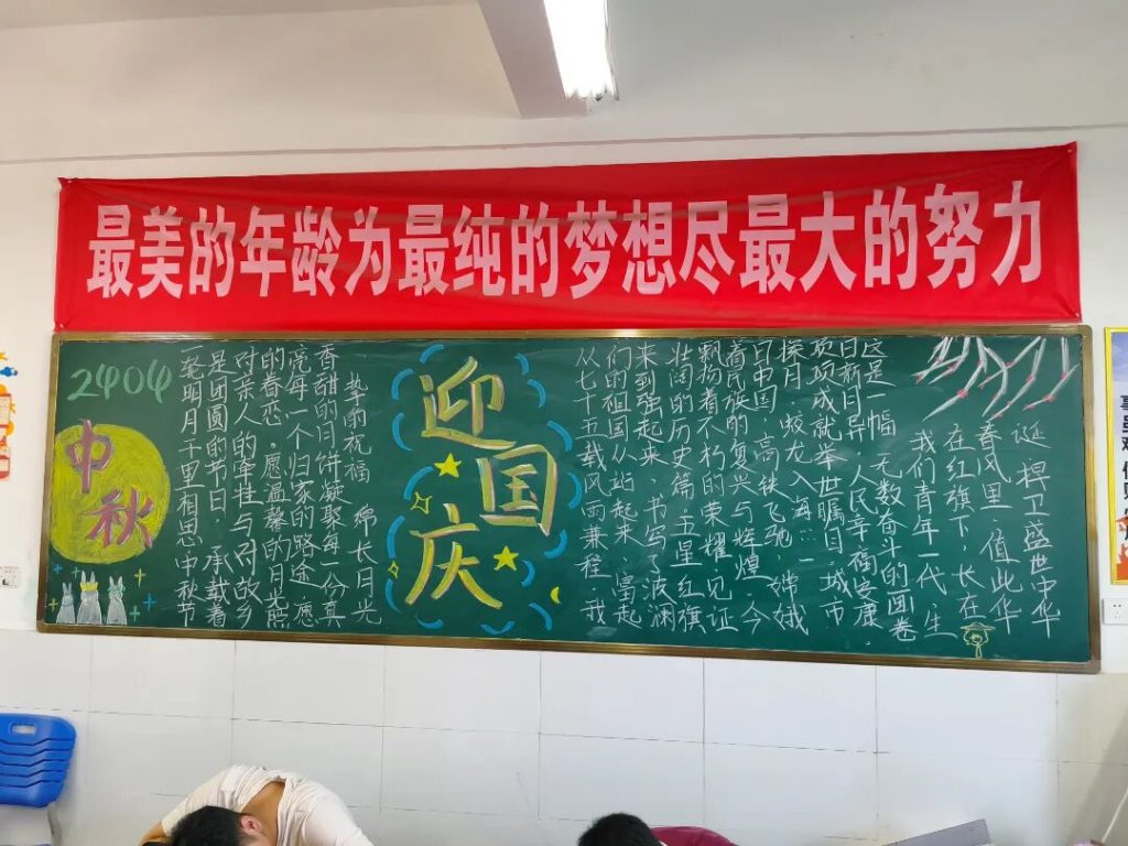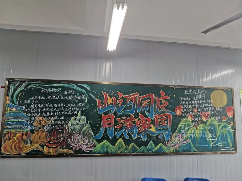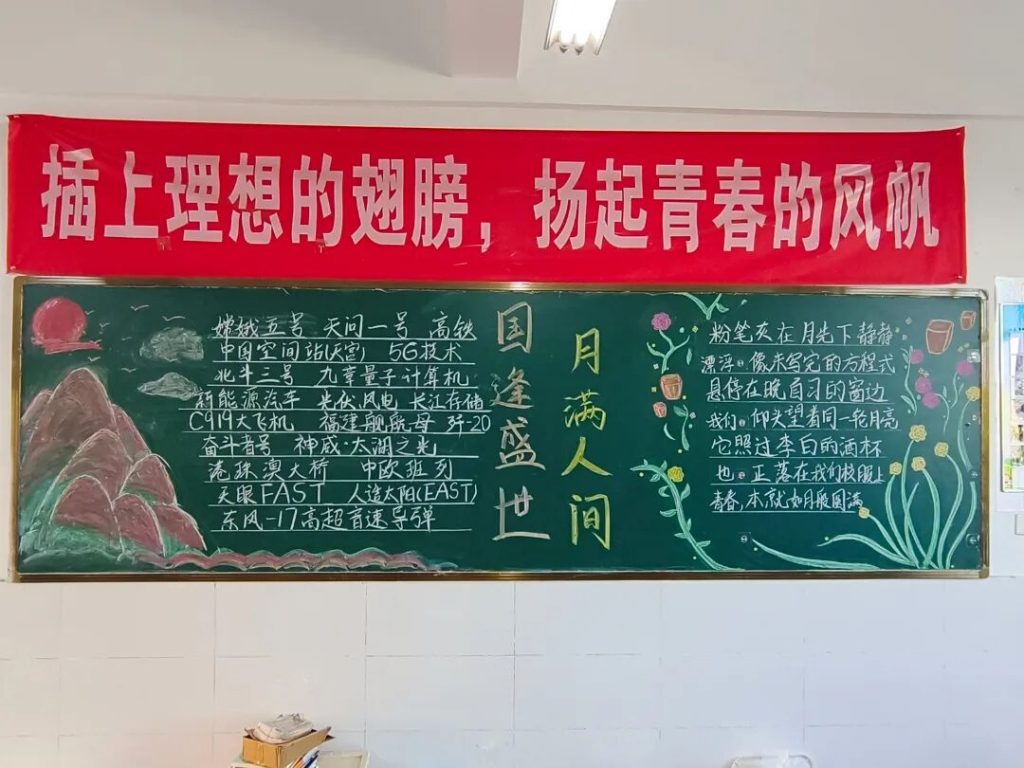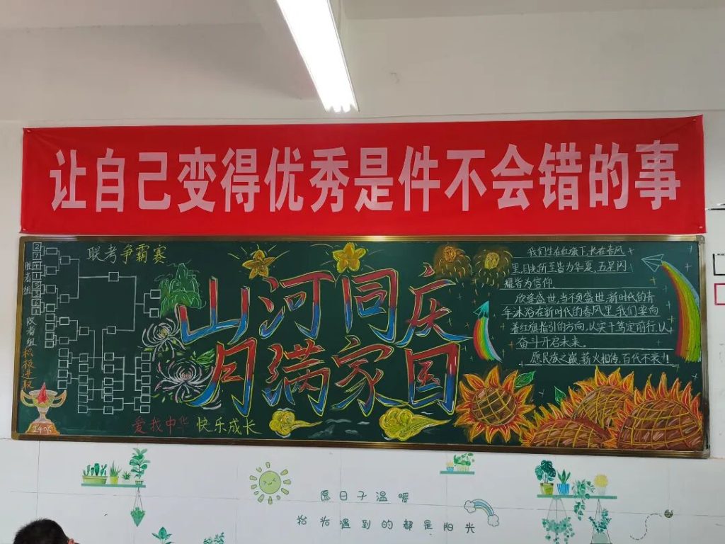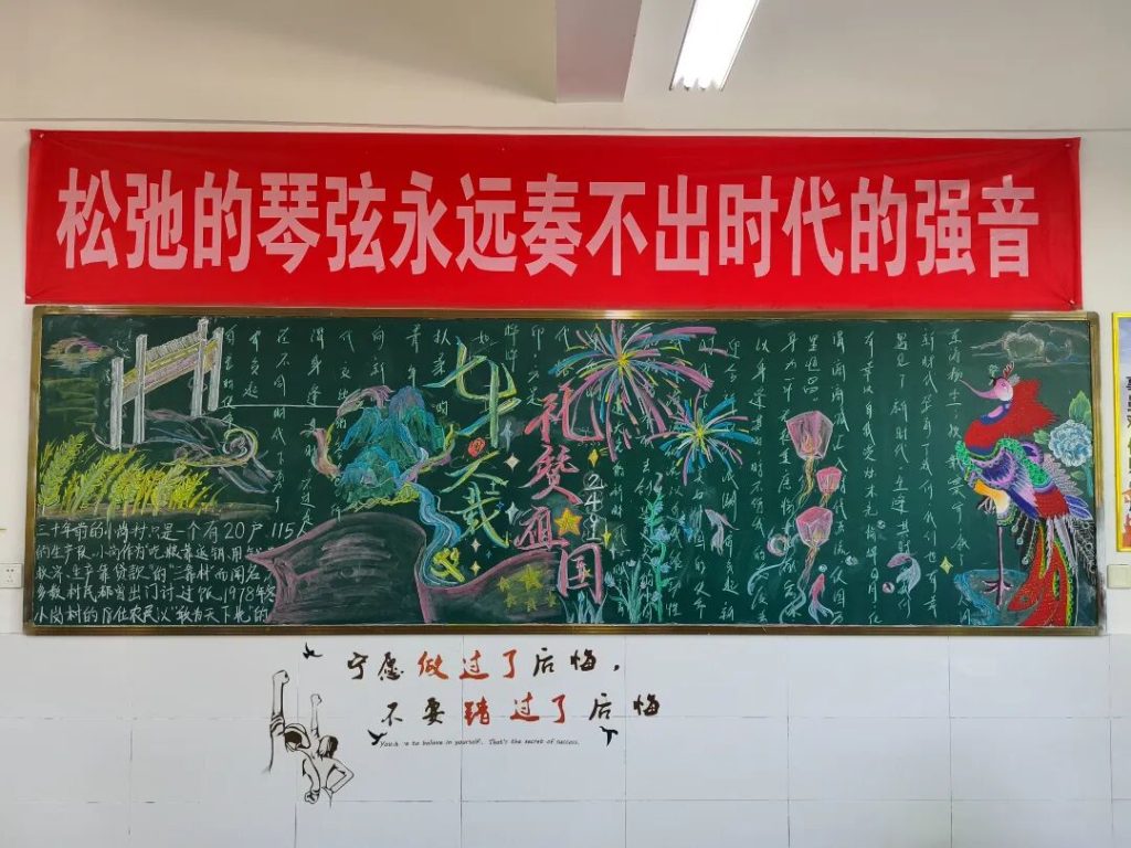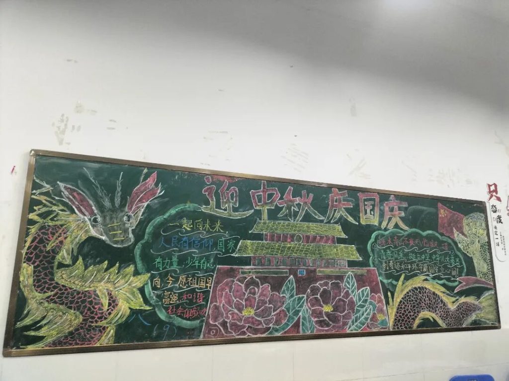 ~ 在庆祝中华人民共和国成立76周年之际,滁州凤阳英华中学组织开展”辉煌七十六载,青春礼赞祖国”主题黑板报评比活动。各班级积极响应,用粉笔绘就盛世图景,以方寸黑板抒发爱国情怀,营造了浓厚的庆祝氛围。