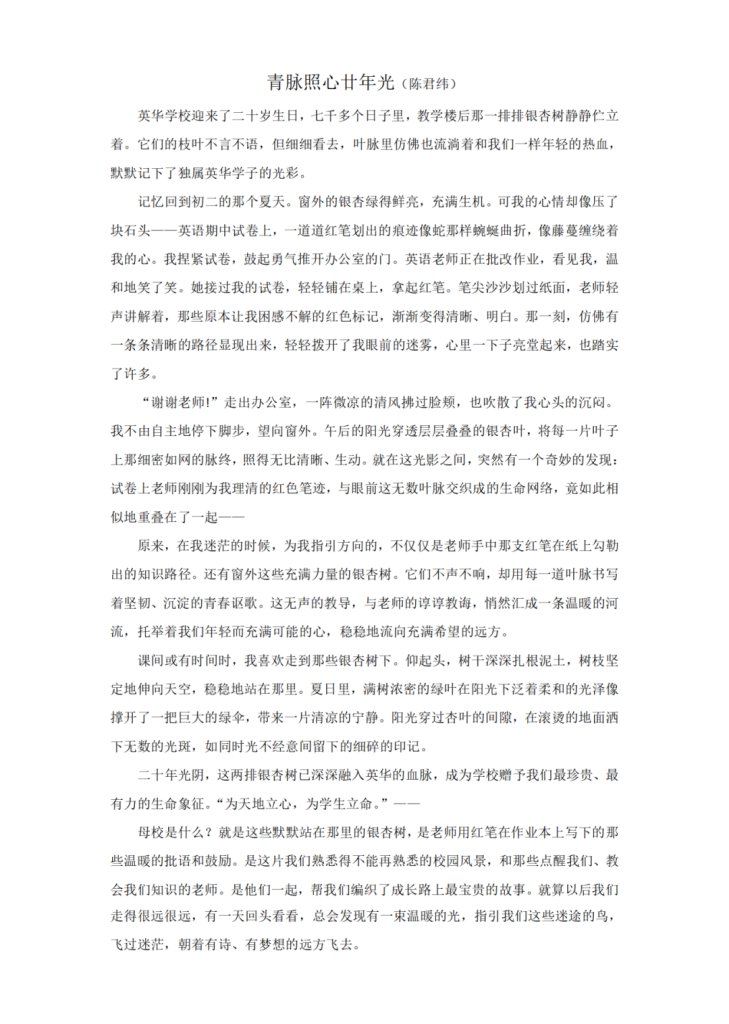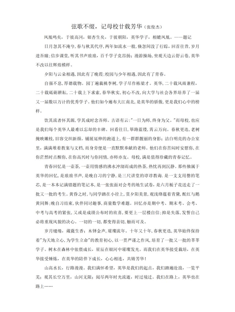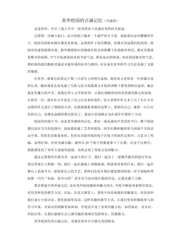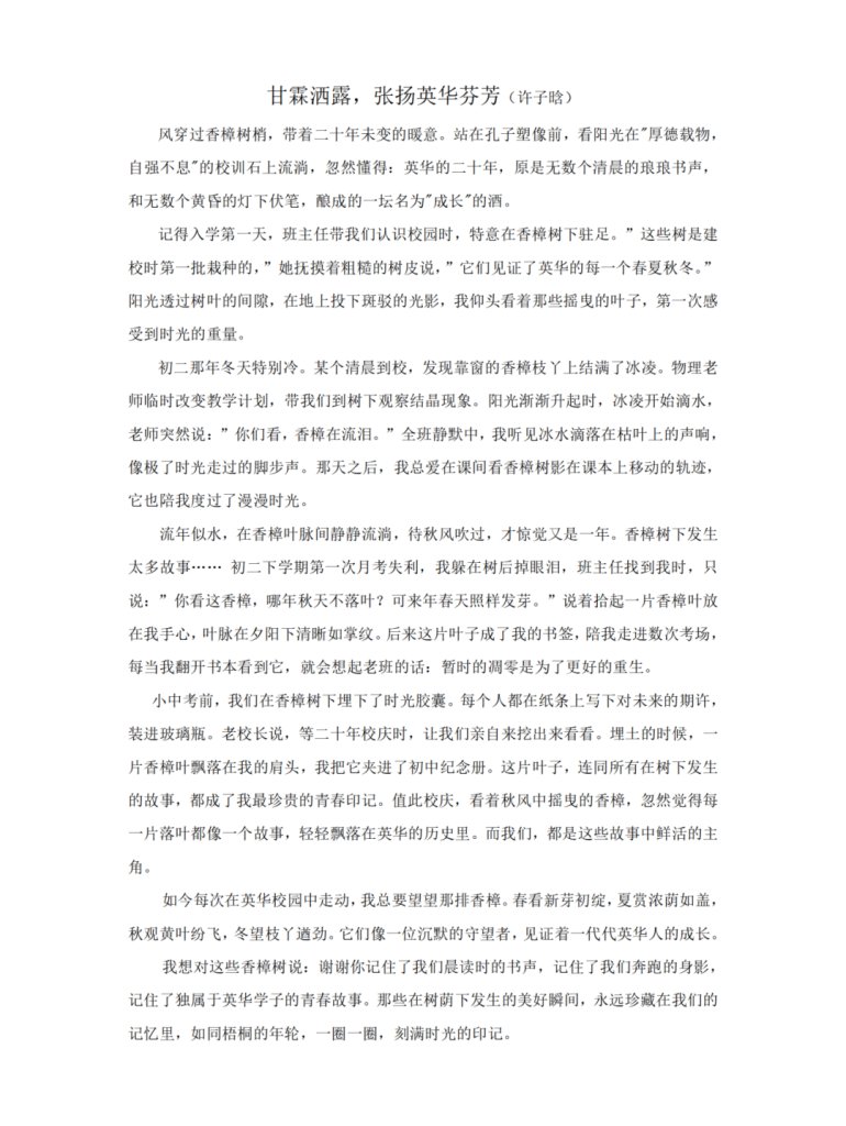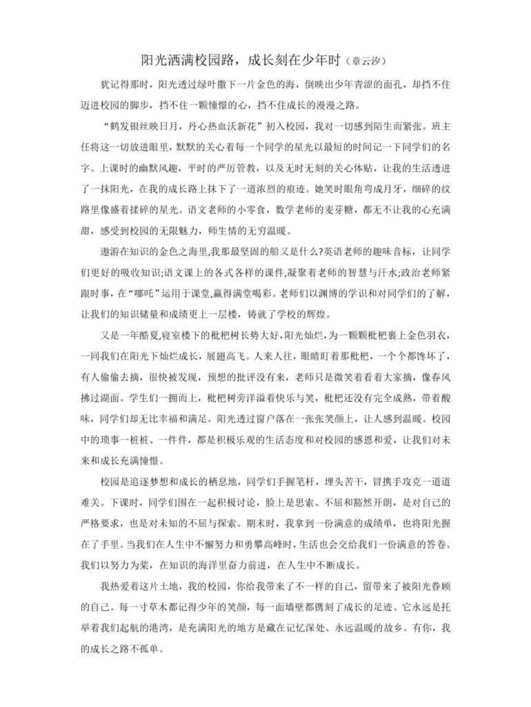 ~ 围绕“知校、爱校、荣校、兴校”主题,学生聚焦具体场景(如一堂难忘的课、一次运动会、与老师的暖心互动等)撰写征文,记录与母校的温暖瞬间。