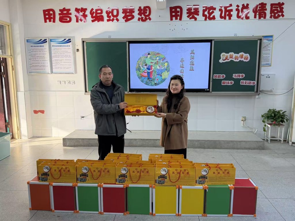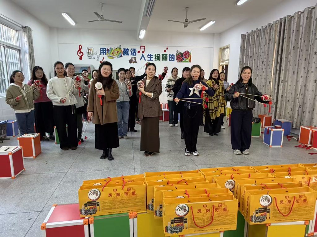 滁州市第二实验小学李奕黛老师展示的四年级音乐《凤阳歌》,课堂氛围生动活泼,让学生在旋律中感受艺术之美;并捐赠20把凤阳花鼓,以非遗文化促进校际交流。