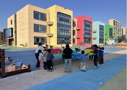 ~ 户外活动中,大家共同参与了充满乐趣的“彩虹伞”游戏。五彩斑斓的伞面起伏飘动,孩子们在其下穿梭、嬉戏,脸上洋溢着纯真快乐的笑容,现场气氛热烈而融洽。活动尾声,孩子们互相交换精心准备的小礼物。