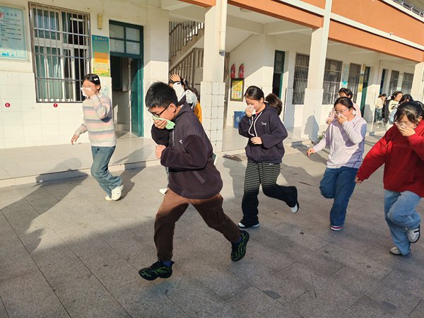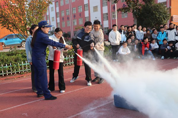 ~ 实操实训环节中,11月12日,第三初中特邀定远县消防救援局队员进校园开展“消防技能训练营”。在消防人员指导下,该校开展七年级全体学生参与的消防应急疏散演练,随着警报声响起,师生们按照预设路线,弯腰捂鼻、快速有序地撤离至安全区域,整个过程紧张高效,进一步强化了“火场会逃生自救”的应急能力。随后,消防员结合校园火灾特点,用通俗易懂的语言向师生们普及了火灾报警流程、初期火灾扑救方法、火场逃生自救技巧等核心知识。