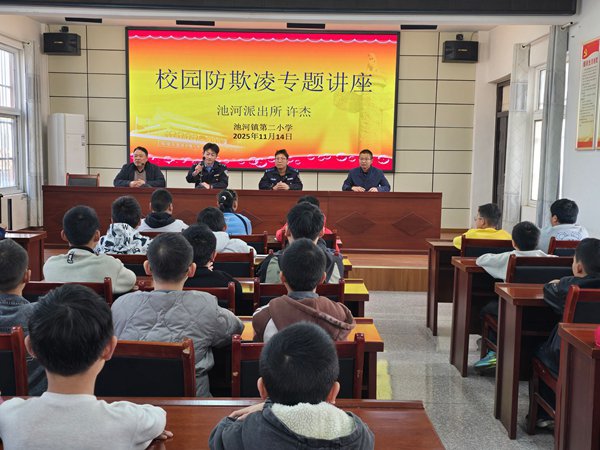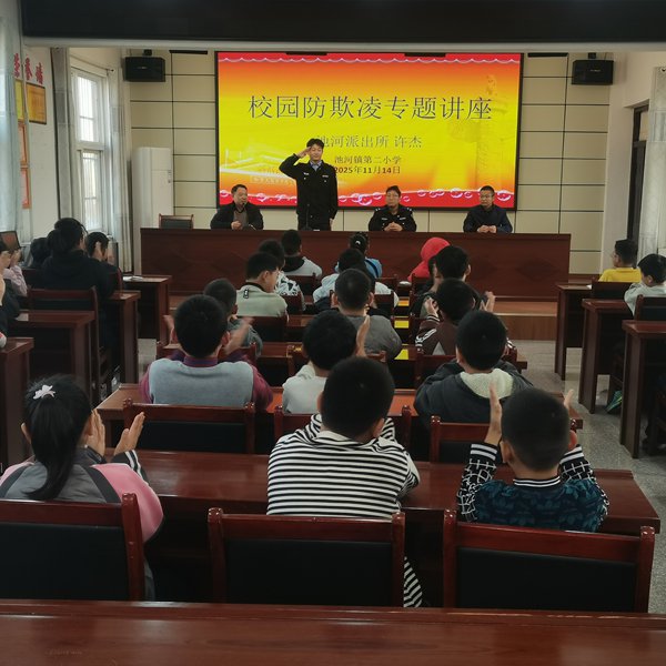 ~ 为进一步强化校园安全管理,有效预防和遏制校园欺凌事件发生,增强学生法治意识与自我保护能力,11月14日上午,定远县池河二小联合池河镇派出所共同举办校园防欺凌专题讲座。派出所民警以专业视角授课,全体师生通过现场聆听、互动问答的方式,接受了一场生动且深刻的法治安全教育。