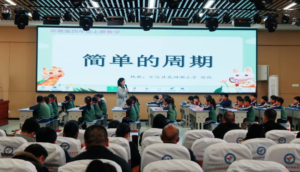 ~ 随后大家共同观摩了由定远县花园湖小学陈忱老师执教的一堂生动有趣的数学公开课——《简单的周期》。课堂中,陈老师以街景为情境,引导学生观察盆花、彩灯等事物的排列规律,巧妙地将学生带入周期现象的学习。学生们在“画一画、圈一圈、算一算”的自主探索中,逐步掌握了“找周期、算余数、判结果”的核心方法。整节课,师生互动高效,课堂气氛活跃。