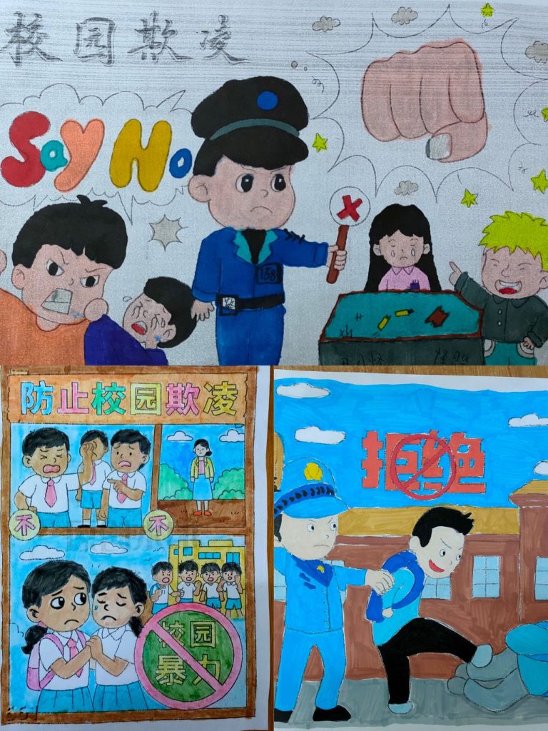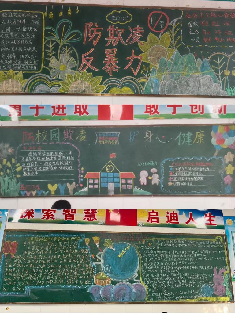 ~ 校园内悬挂宣传横幅、班级出专题黑板报、举办手抄报比赛,营造浓厚反欺凌氛围。