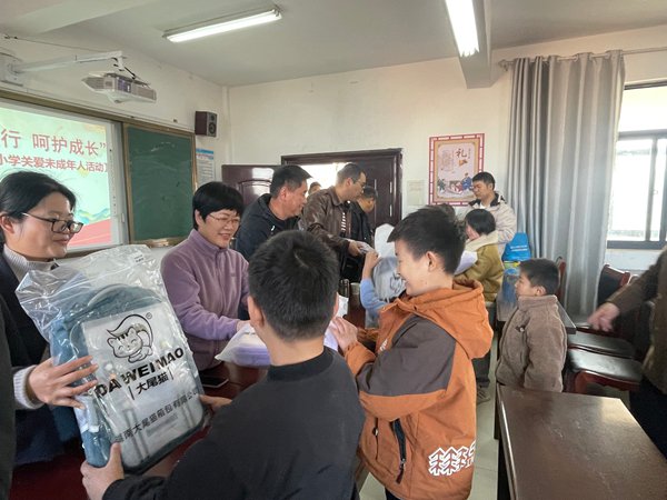 ~ 活动现场,主办方为学校学生送上50个书包,传递关怀与温暖。滁州市中西医结合医院的医生带来眼科知识讲座,带领学生规范做眼保健操,并为大家进行体格检查、发放健康宣传手册。此外,活动还设置爱国主义教育、《未成年人保护法》及网络保护条例宣讲、心理健康教育等环节,通过奏唱国歌、红色故事分享、案例讲解等形式,全方位守护乡村儿童身心健康。