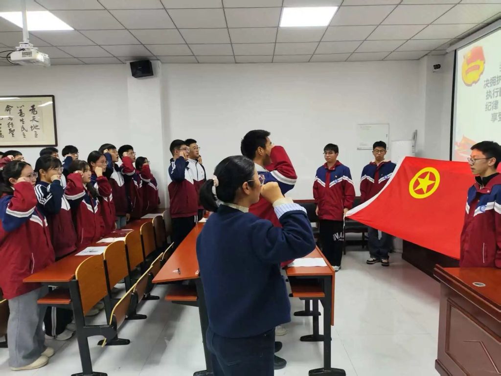 ~ 在鲜艳的团旗见证下,年级学生会代表作为领誓人,带领全体新团员庄严宣誓:“我志愿加入中国共产主义青年团,坚决拥护中国共产党的领导,遵守团的章程,执行团的决议……”誓言铿锵,信念如磐,表达了新团员们立志为共产主义事业贡献青春力量的坚定决心。