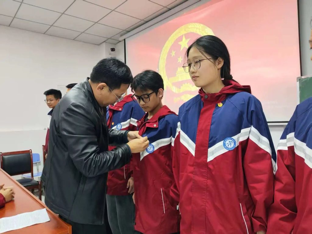 ~ 仪式在雄壮的国歌声中拉开序幕。全体人员肃立致敬,现场气氛庄重。邓亚婷老师宣读了新团员名单,新团员们精神饱满、目光坚定,展现出昂扬向上的青春风采。随后,张健、李大双、李武依次为新团员佩戴团徽。团徽不仅是一枚徽章,更是共青团员使命与责任的象征。当团徽在胸前熠熠生辉,每一位新团员的眼中都闪烁着光荣与坚定。