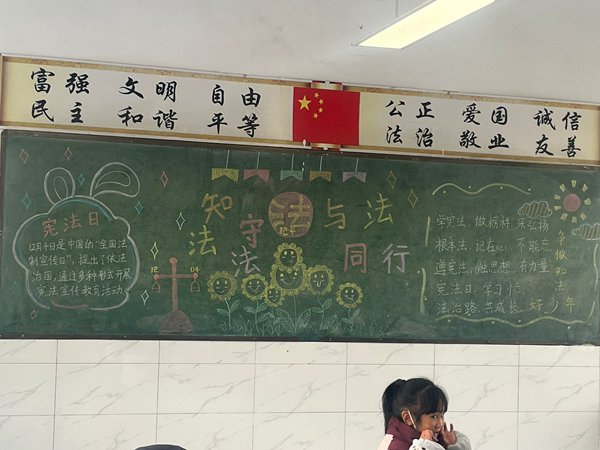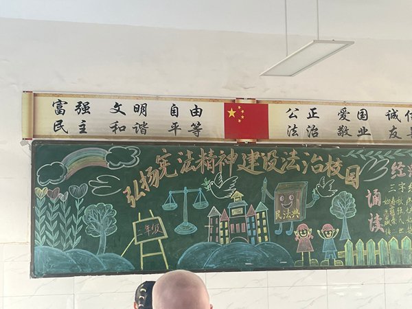 ~ 为让宪法知识深入人心,各班级还开展了“宪法知识黑板报”制作活动。黑板上,图文并茂的宪法知识、色彩鲜明的法治宣传画,不仅展现了农村学子的创意与才华,更成为班级里一道独特的“法治风景线”。