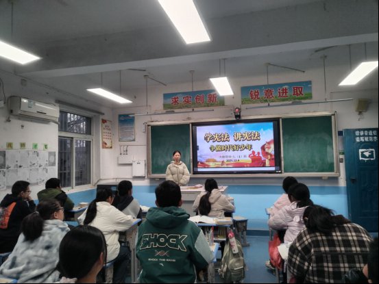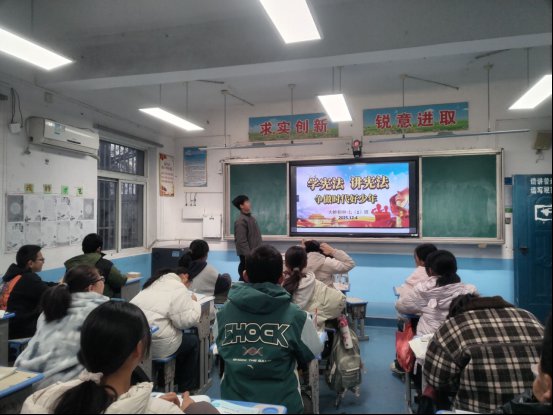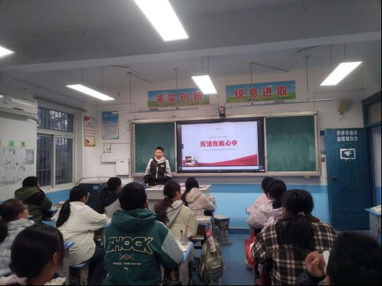 宣传周期间,各班级同步召开“学宪法、讲宪法”主题班会。班主任结合校园日常、未成年人保护等鲜活案例,用通俗易懂的语言解读宪法核心要义,通过知识问答、小组研讨等互动形式,引导学生树立正确的权利义务观,学会用法律武器守护自身权益。同时,学校充分利用校园广播、电子显示屏等载体,滚动推送宪法宣传标语、短视频,营造“处处是课堂、时时能学法”的浓厚普法氛围。