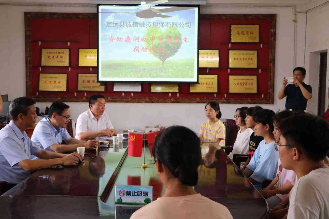 6月12日,定远县诚信融资担保有限公司董事长金勇、经理王远率领公司员工,到桑涧初中开展资助贫困学生活动。