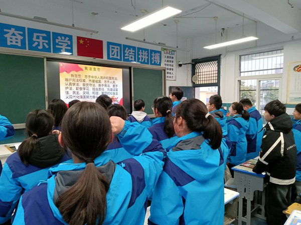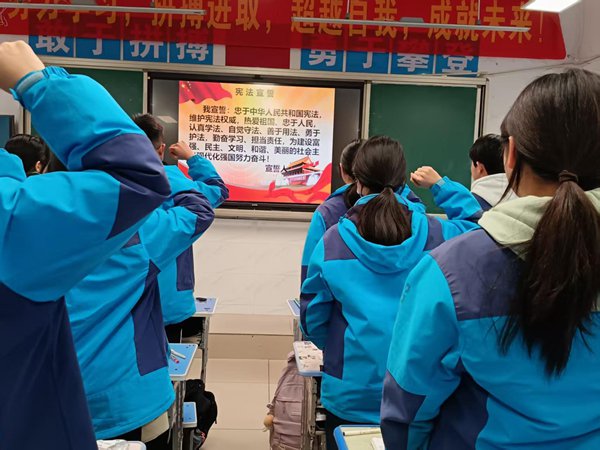 ~ 课堂内外,学法氛围愈发浓厚。清晨的校园里,各班级开展宪法晨读活动,同学们精神饱满地诵读宪法序言及核心条款,从中感受国家根本大法的庄严与权威。在各班召开的“学宪法 讲宪法”主题班会中,班主任通过案例分析、互动问答等形式,深入浅出讲解宪法基本原则,结合校园欺凌、网络安全等热点话题,引导学生辨析是非、明确权责。同时,班主任宣读了《遵守宪法倡议书》,倡导广大学生学法、知法、守法,做文明、守信、明理的中学生,遵守各项法规,努力争当遵纪守法的典范。随后,学子们高举右拳,集体进行宪法宣誓,铿锵有力的誓言回荡在校园上空,将对宪法的敬畏与信仰深深镌刻在每个人心中。