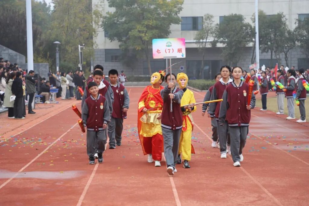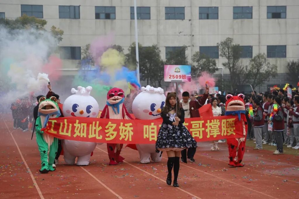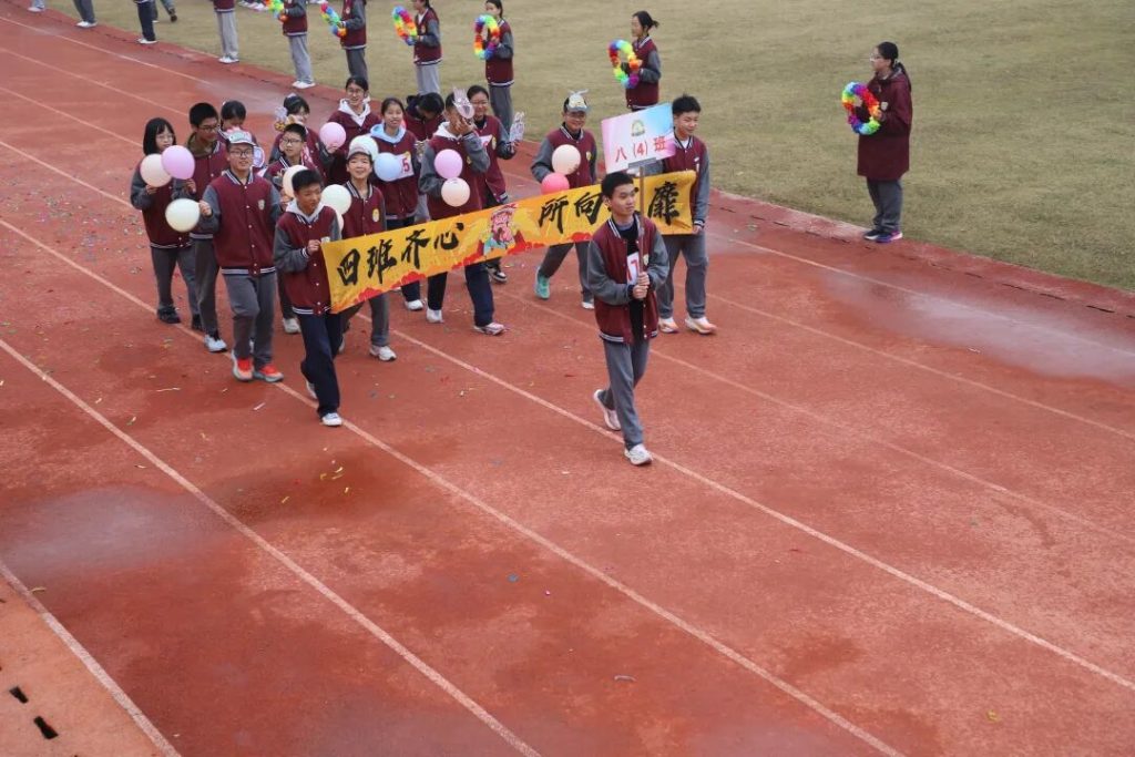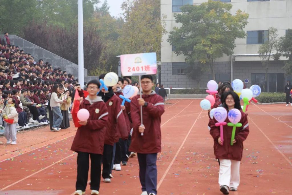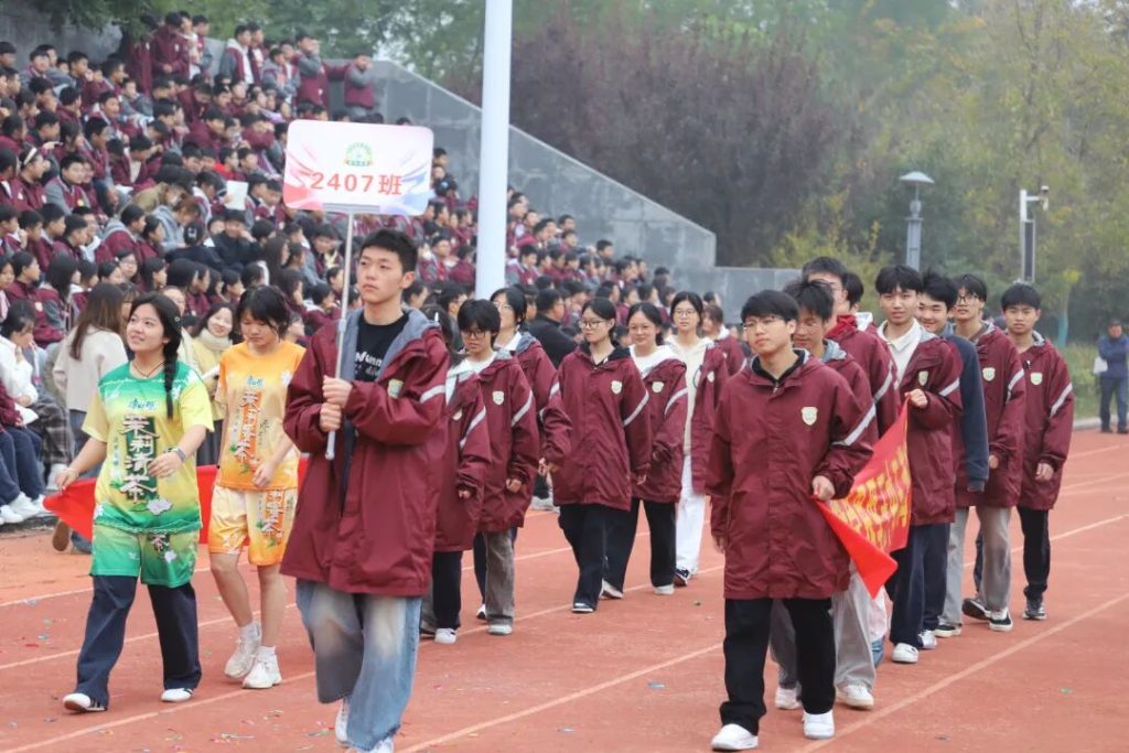 ~ 开幕式上,伴随着激昂的《运动员进行曲》,各班方阵身着统一服装,迈着整齐有力的步伐依次入场,同学们精神抖擞,手中的彩旗与花束迎风舞动,展现出蓬勃的青春朝气。