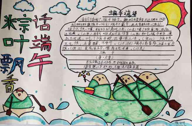 活动中,各班陆续开展以“粽叶飘香话端午”为主题的班队会,让学生进一步了解端午节的由来、有关传说、各地的风俗习惯、端午节的诗词文化等。在大队辅导员高国权的组织安排下,各班展示了一期以“粽叶飘香话端午”为主题的黑板报,并制作了一份主题手抄报。此外,各班还引导学生在家里开展一次“我与妈妈共同包粽子”的活动,引导学生通过亲自动手尝试,感受传统节日的内涵。