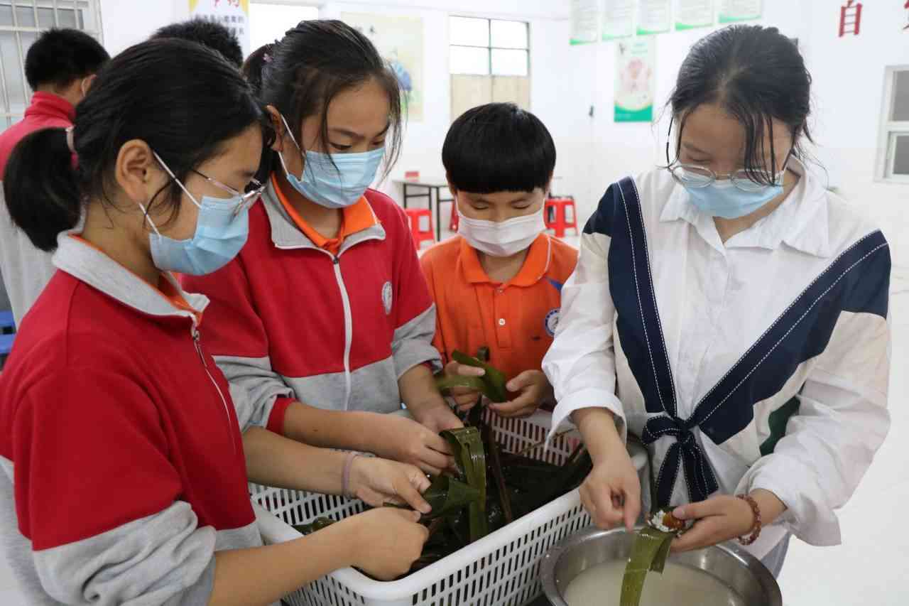 ~ “爱心妈妈”和孩子们分工协作,准备工作进行得井然有序。开始包粽子了,“爱心妈妈”在一旁悉心指点,一边手把手地教留守未成年人裹粽子,一边讲述端午节包粽子的由来并关切地询问学习和生活情况,让孩子们在不知不觉中了解了传统节日……叠粽叶、装糯米、放馅料、捆棕绳,留守未成年人用线把老师对自己的爱系在心上,现场到处洋溢着浓浓的亲情。