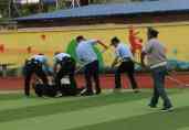11点10分,反恐防暴演练正式开始。一名“暴徒”手持“凶器”突然冲入校园,欲对校园内学生实施暴力伤害,当场打倒一名保安。其他保安人员第一时间围追持械歹徒。同时校园警报声响起。能仁派出所接到报警后,迅速出警,联合学校保安人员将“歹徒”成功控制并带离现场。