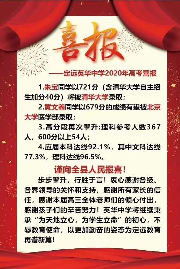 ~ 2020年7月23日,定远县英华中学2020年高考喜讯:1、朱宝同学达清华大学录取分数线;2、黄文鑫同学有望被北京大学录取;3、英华中学高分段再次攀升:理科参加考试人数367人…