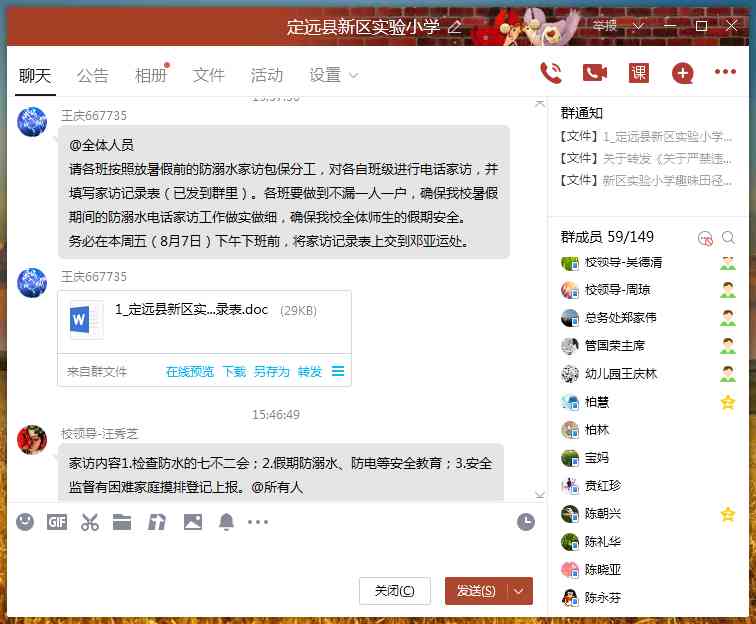 学校要求班主任每天通过班级QQ群、微信群、短信等给监护人发送提醒信息,督促监护人履行好监护责任,并组织教师开展了电话家访活动,对假期防溺水、防电等安全教育进行再宣传,检查防溺水安全教育“七不两会”,填写家访记录表,对安全监督有困难的家庭及时登记上报,真正做到不漏一户不漏一生,坚决杜绝溺水事故的发生。(汪秀芝 周靖)